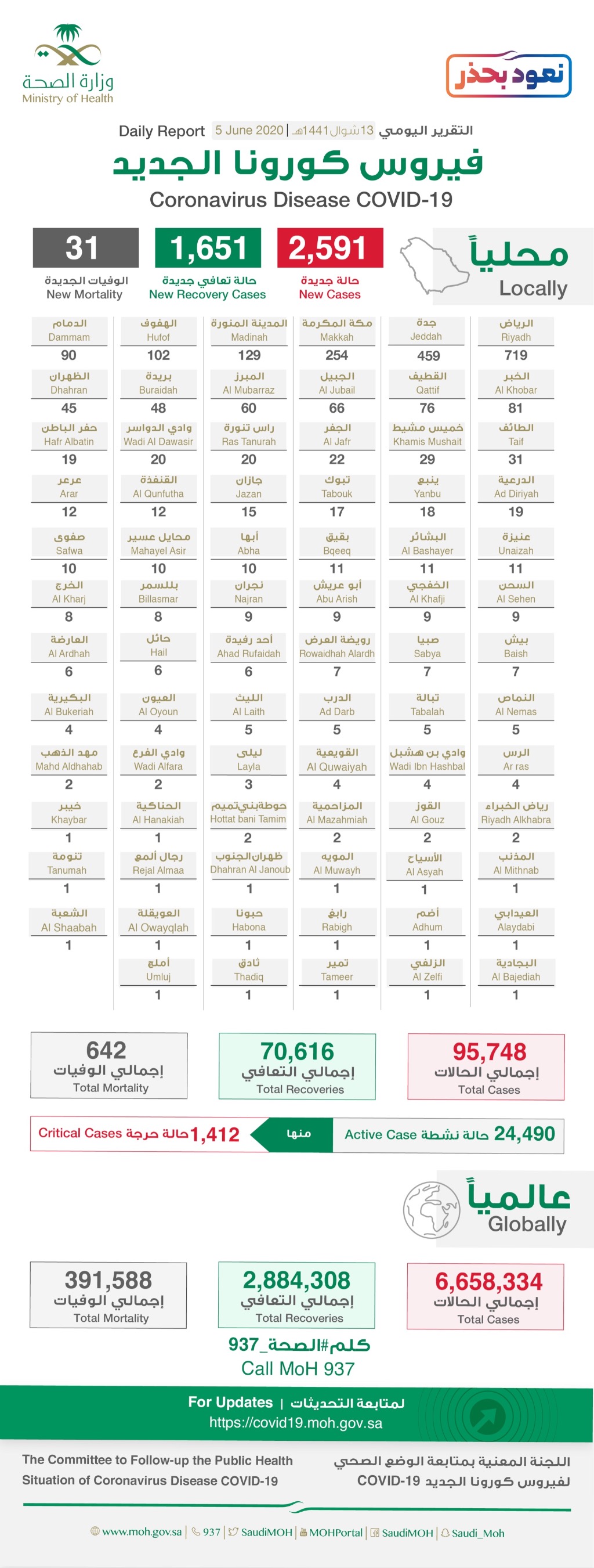 الصحة: تسجيل 2591 إصابة جديدة بكورونا.. منها 76 في القطيف و10 بصفوى