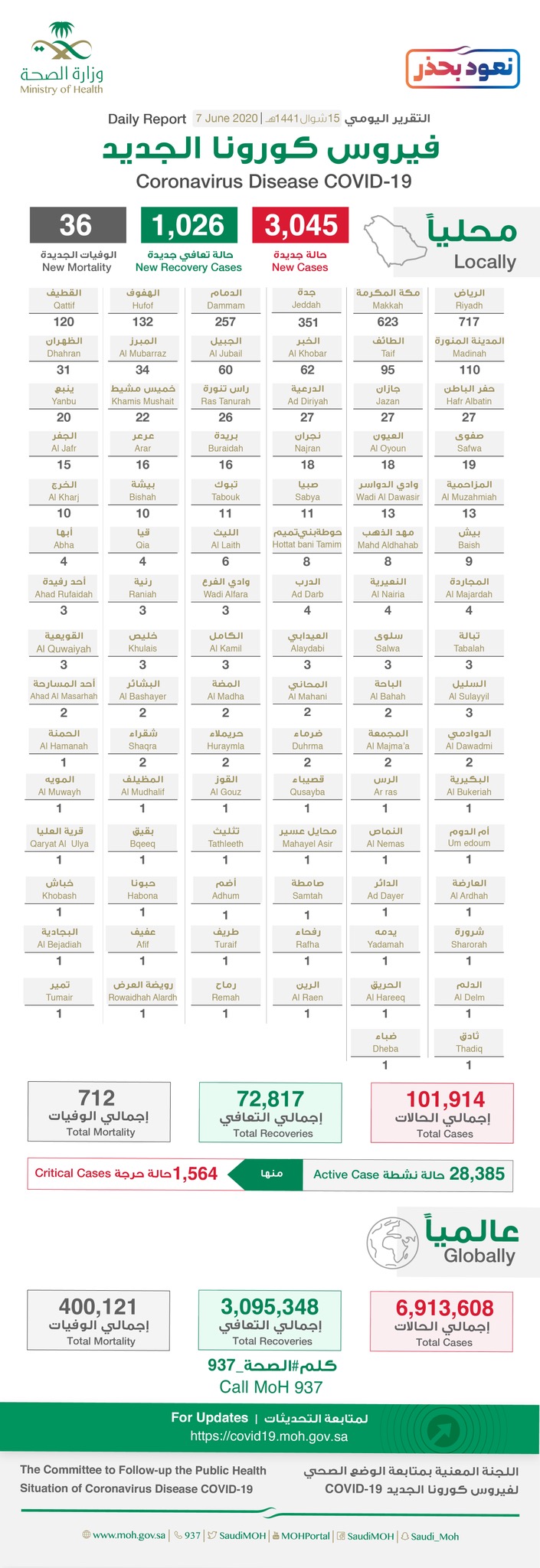 أعلنت وزارة الصحة، اليوم الأحد، تسجيل 3045 إصابة جديدة بفيروس ”كورونا“ المستجد ”كوفيد - 19“ في المملكة. منها 120 في القطيف و19 بصفوى.
