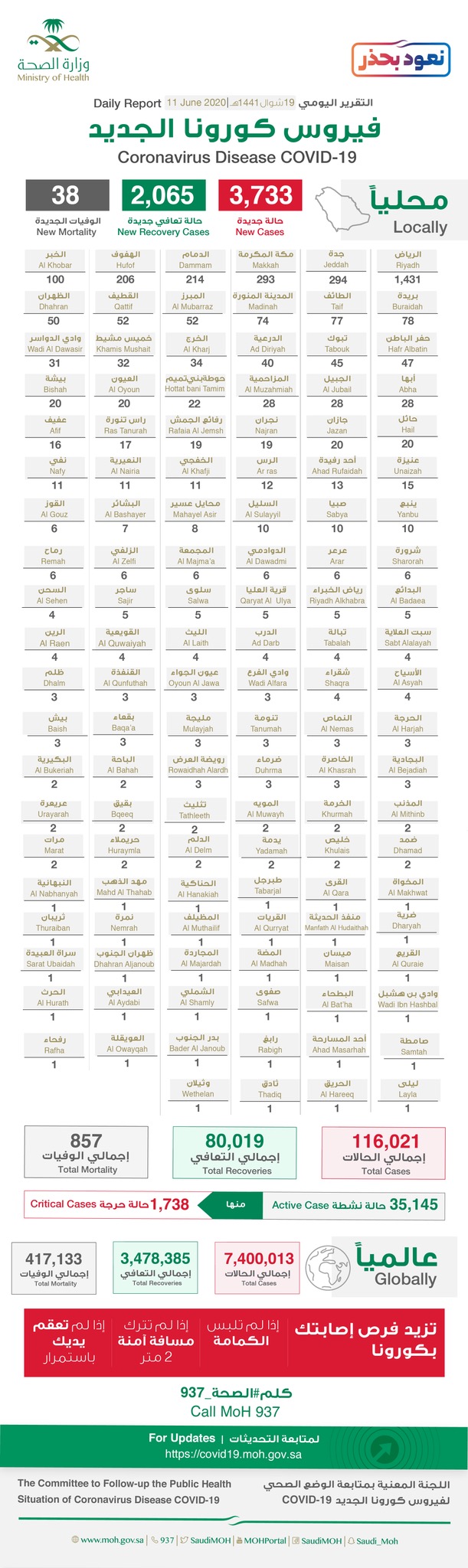 وتم تسجيل 2065 حالة تعافٍ جديدة منها 108 في القطيف وحالة واحدة بصفوى، لترتفع الحالات الإجمالية للتعافي إلى 80019 حالة (69 % من إجمالي الإصابات المسجلة).