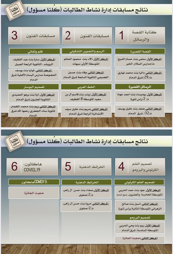 وعلى صعيد آخر، أعلنت إدارة نشاط الطالبات بالإدارة العامة للتعليم بالمنطقة الشرقية اليوم الثلاثاء 24 / 10 / 1441 نتائج مسابقة إدارة نشاط الطالبات على مستوى مدارس البنات بالمنطقة الشرقية «كلنا مسؤول».