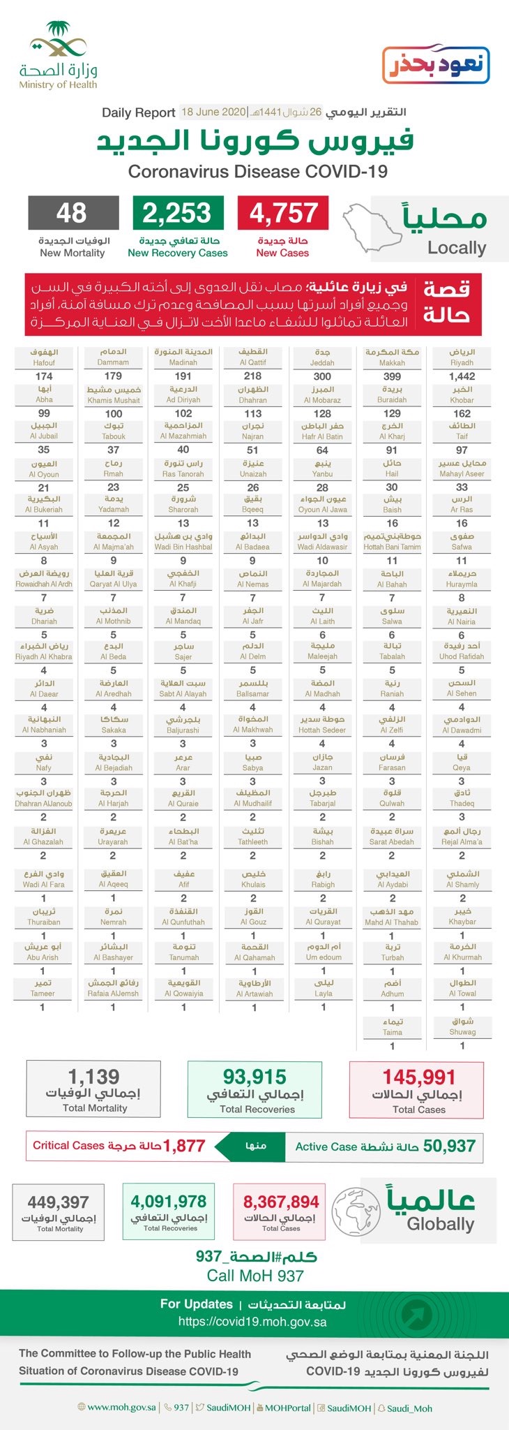 بلغ إجمالي الحالات النشطة 50937 حالة، منها 1877 حالة حرجة.