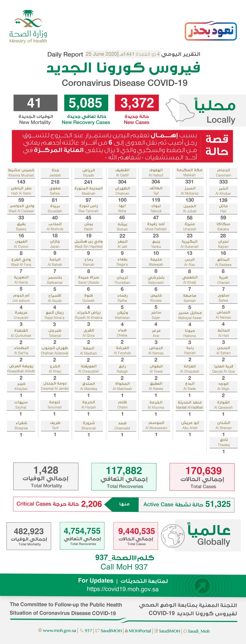وتم تسجيل 5085 حالات تعافٍ جديدة منها حالة واحدة في القطيف، لترتفع الحالات الإجمالية للتعافي إلى 117882 حالة (69 % من إجمالي الإصابات المسجلة).
