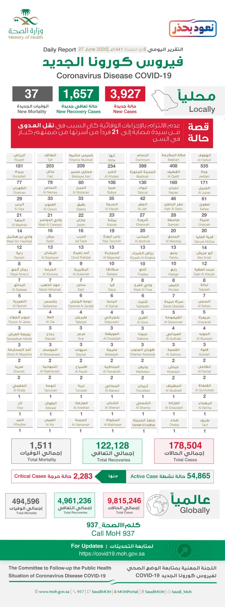 وأعلنت الوزارة تسجيل 37 حالة وفاة جديدة منها حالة واحدة في القطيف، ليصل عدد الوفيات الكلي إلى 1511 حالة وفاة.
