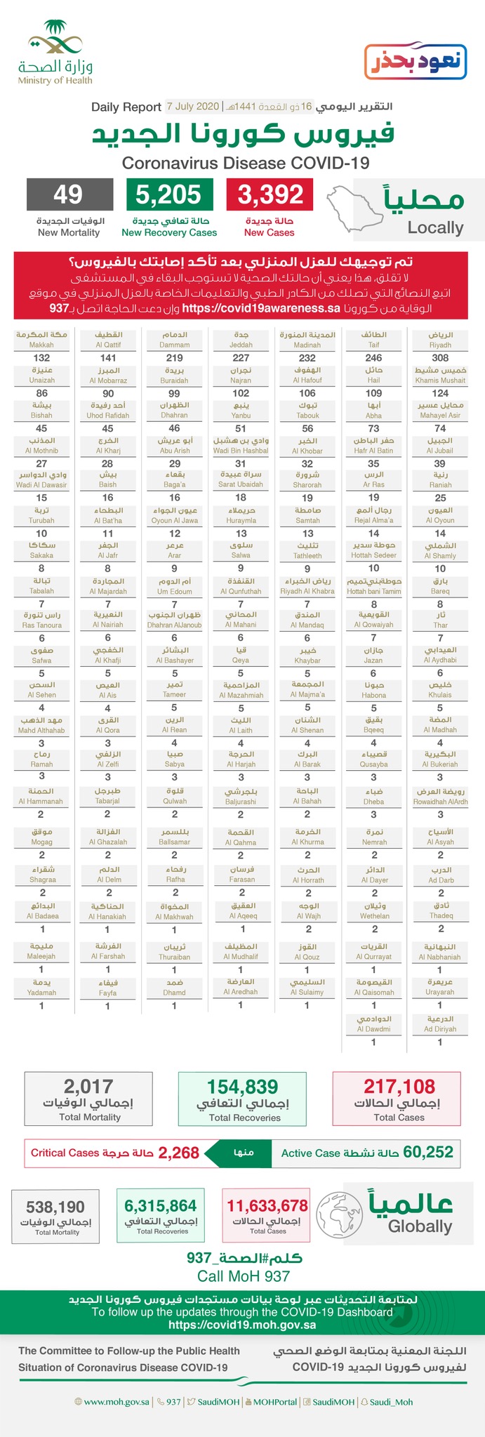 أعلنت وزارة الصحة، اليوم الثلاثاء، تسجيل 3392 إصابة جديدة بفيروس ”كورونا“ المستجد ”كوفيد - 19“ في المملكة. منها 141 في القطيف و5 في صفوى. ليرتفع إجمالي الإصابات في المملكة إلى 217108 حالات مؤكدة.