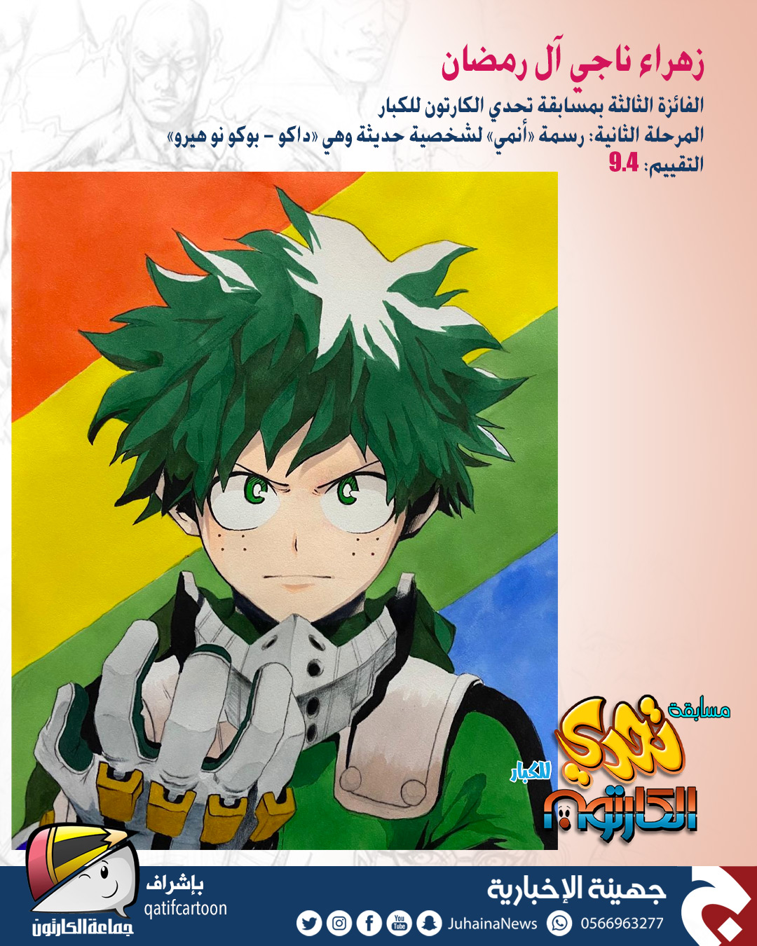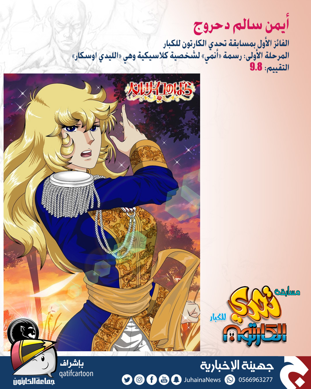 حقّق المتسابق أيمن الدحروج المركز الأول في مسابقة ”تحدي الكارتون“ للكبار التي نظمتها صحيفة جهينة الإخبارية بإشراف جماعة الكارتون.
