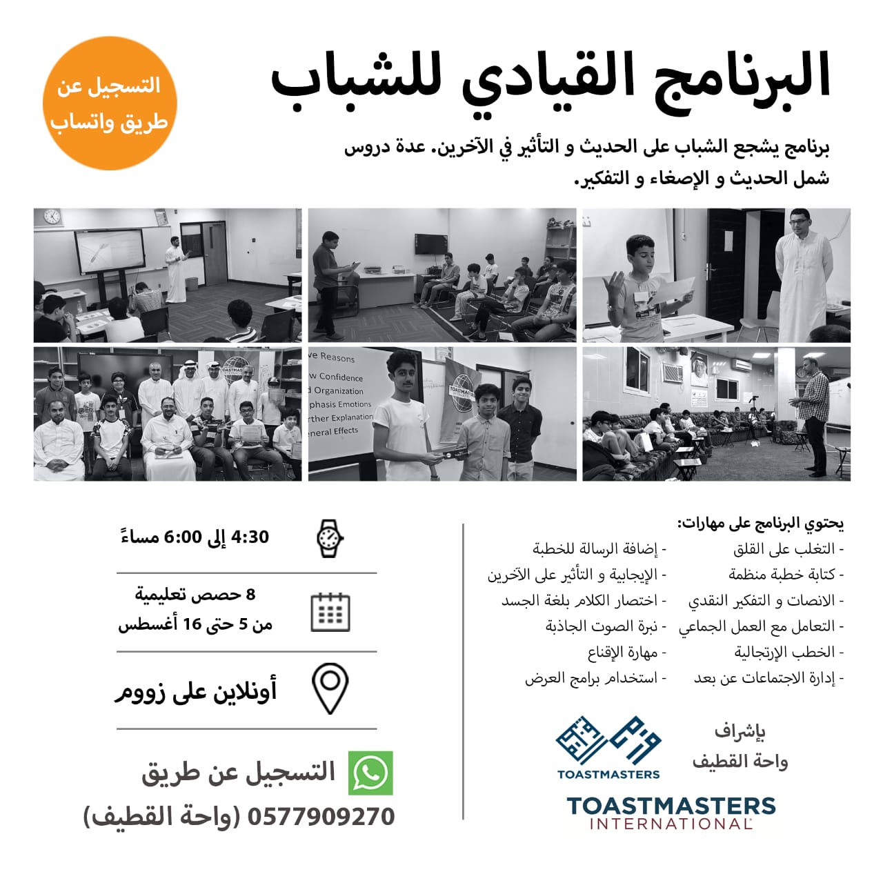 بدأ البرنامج القيادي للشباب الذي يقدمه نادي واحة القطيف توستماسترز اليوم الأربعاء.