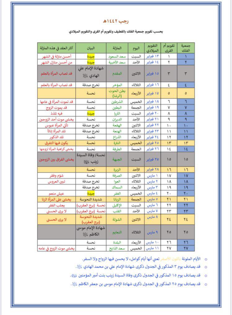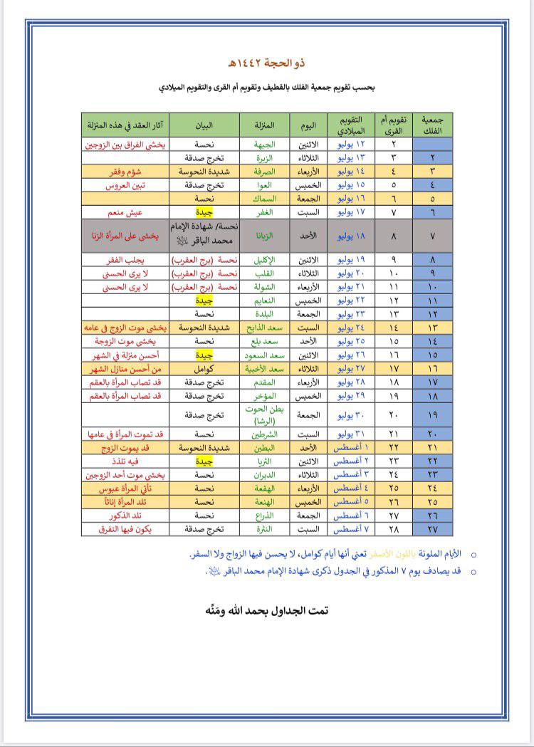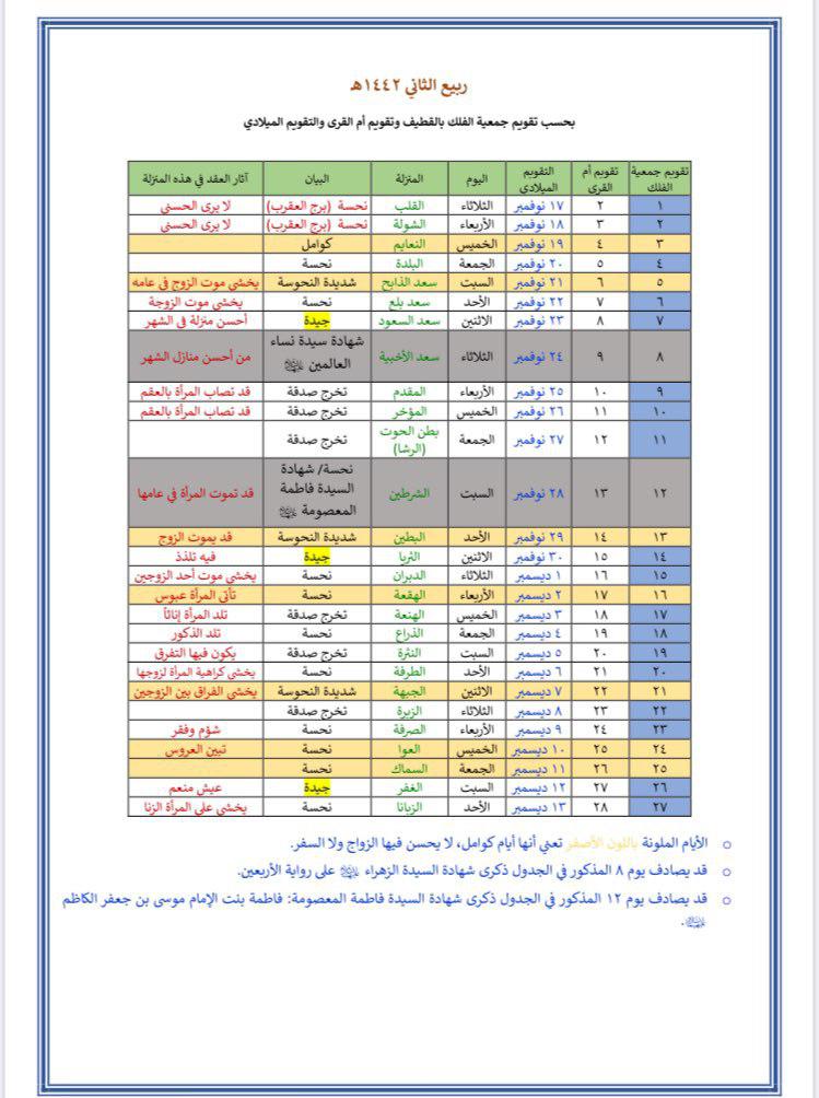 وأصدر مكتب الشيخ آل محسن جدولا يبين الأيام الجيدة والنحسة لعقد الزواج خلال العام القادم 1442 للهجرة، وتم وفقا للحساب الفلكي وليس الثبوت الشرعي، لأن الأثار التي تترتب على العقد هي آثار تكوينية وتتعلق بوضع القمر في المنازل المذكورة.