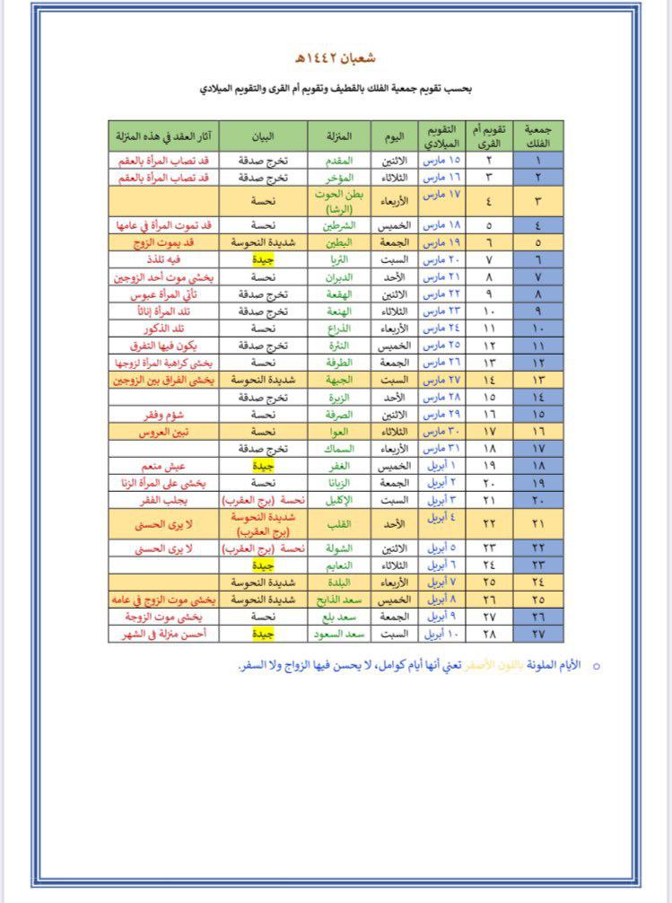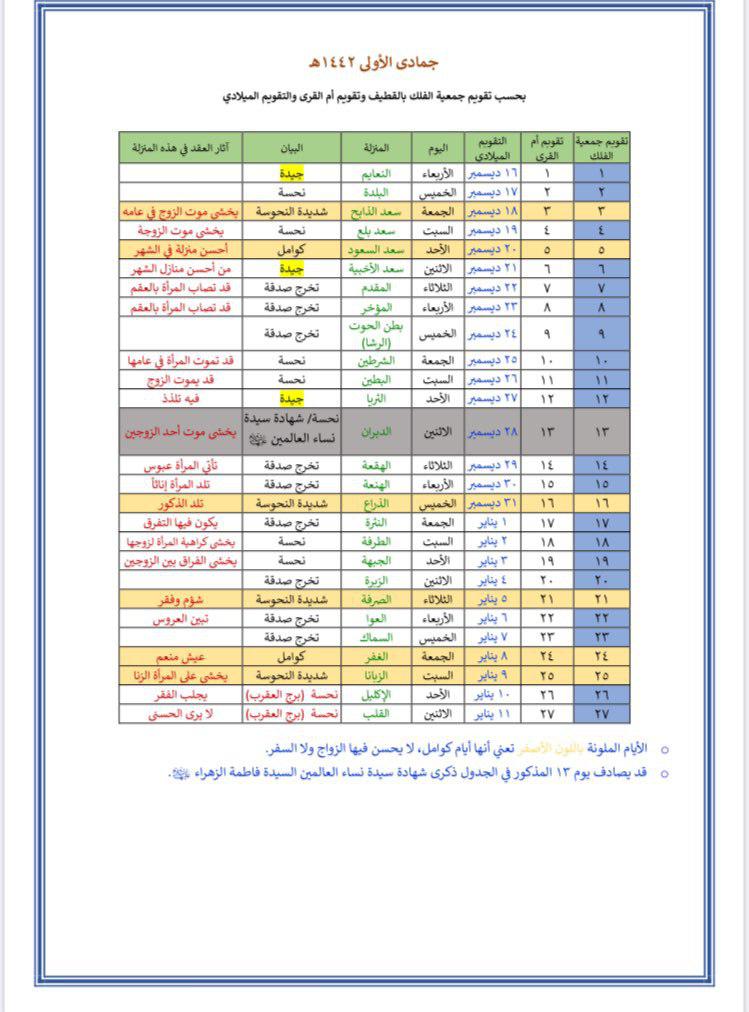 ومن المعلوم أن كل شهر فيه سبعة أيام نحسة، وتسمى ”الكوامل“ وهي «3,5,13,16,21,24,25» من الشهر العربي.