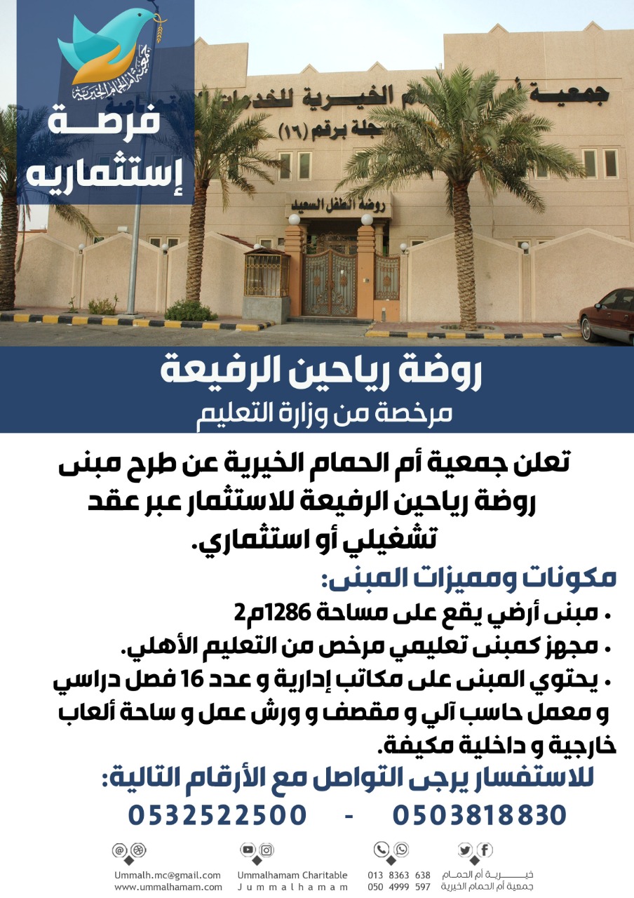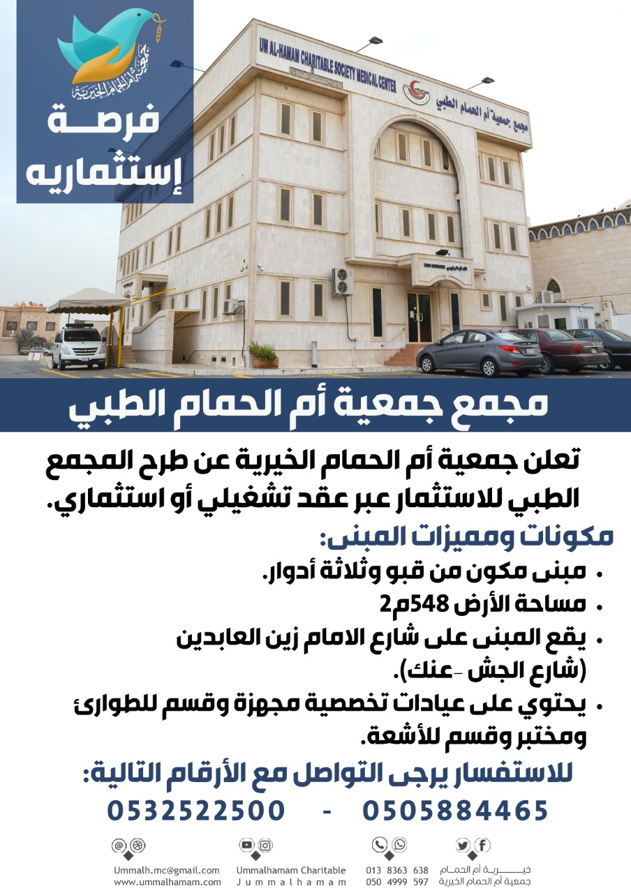 قال رئيس مجلس إدارة خيرية أم الحمام؛ حسين آل جبر بأنه قرر مجلس الإدارة طرح حزمة من المشاريع والمنشآت التابعة للجمعية للاستثمار العام وإتاحة الفرصة للمستثمرين الجادين من أجل تحقيق ديمومة مالية ثابته وتنمية إقتصادية وتحقيق الأهداف التي من أجلها أنشئت هذه المشاريع.