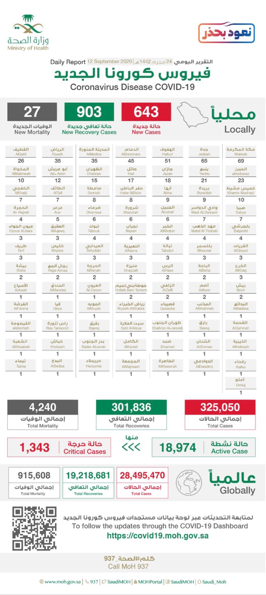 ووفقا لإحصاء ”الصحة“ اليوم، فقد بلغ إجمالي حالات الإصابة تراكميا منذ ظهور أول حالة في المملكة 325,050 حالة، من بينها 18,974 حالة نشطة، منها 1343 حالة حرجة.