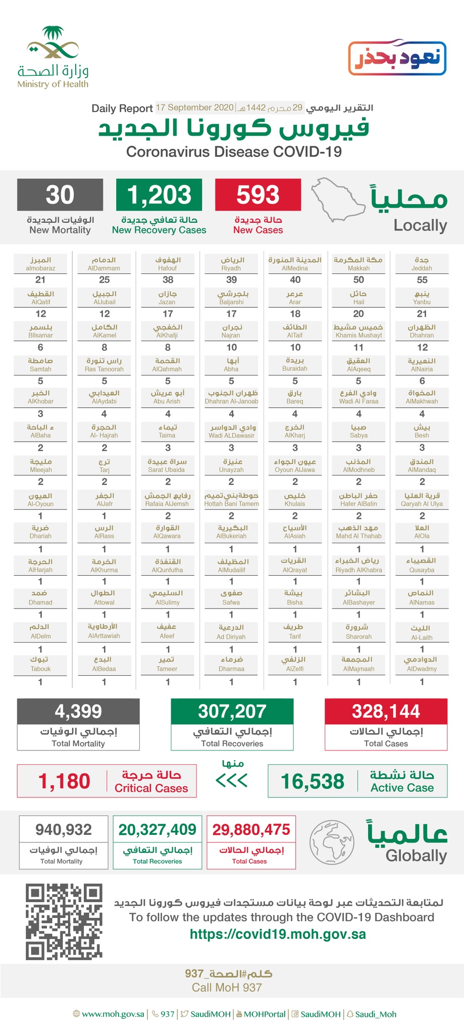 أعلنت وزارة الصحة اليوم ”الخميس“ تسجيل 593 إصابة جديدة بفايروس كورونا المستجد المسبب لمرض ”كوفيد19“. منها 12 في القطيف و1 بصفوى. ليصبح عدد الحالات المؤكدة في المملكة «328144» حالة.