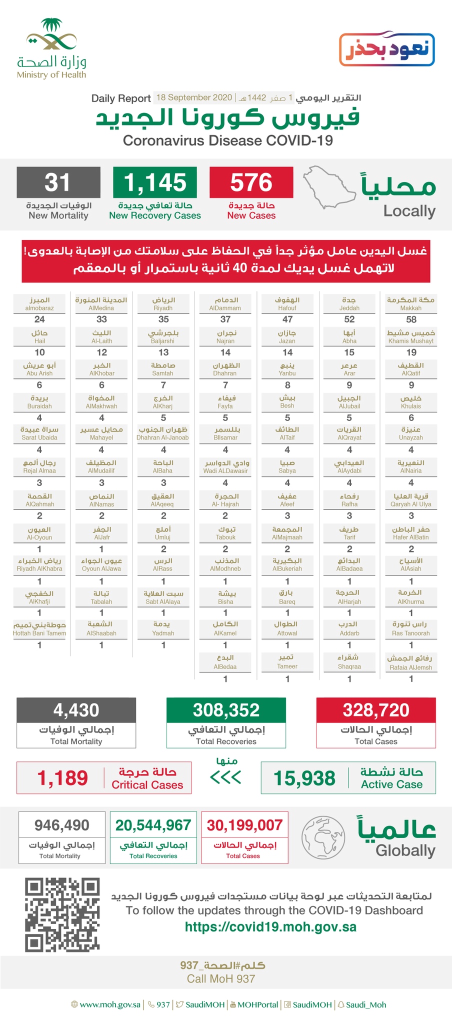 كما تم تسجيل «1145» حالات تعافي جديدة منها 46 في القطيف و11 بصفوى، ليصل عدد المتعافين إلى «308052» حالات. (94% من إجمالي الإصابات المسجلة).