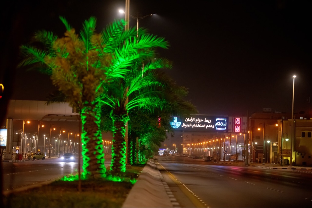 ولفت الى تركيب 190 من الأشكال الجمالية المضيئة، وتركيب إنارة وتزيين وتلوين 8 مباني بإضاءة LED city color، وأجهزة الإضاءة المتحركة، وعرض تصاميم اليوم الوطني، وعروض الفيديو ماب الخارجي لموقعين على ستاند خشبي.
