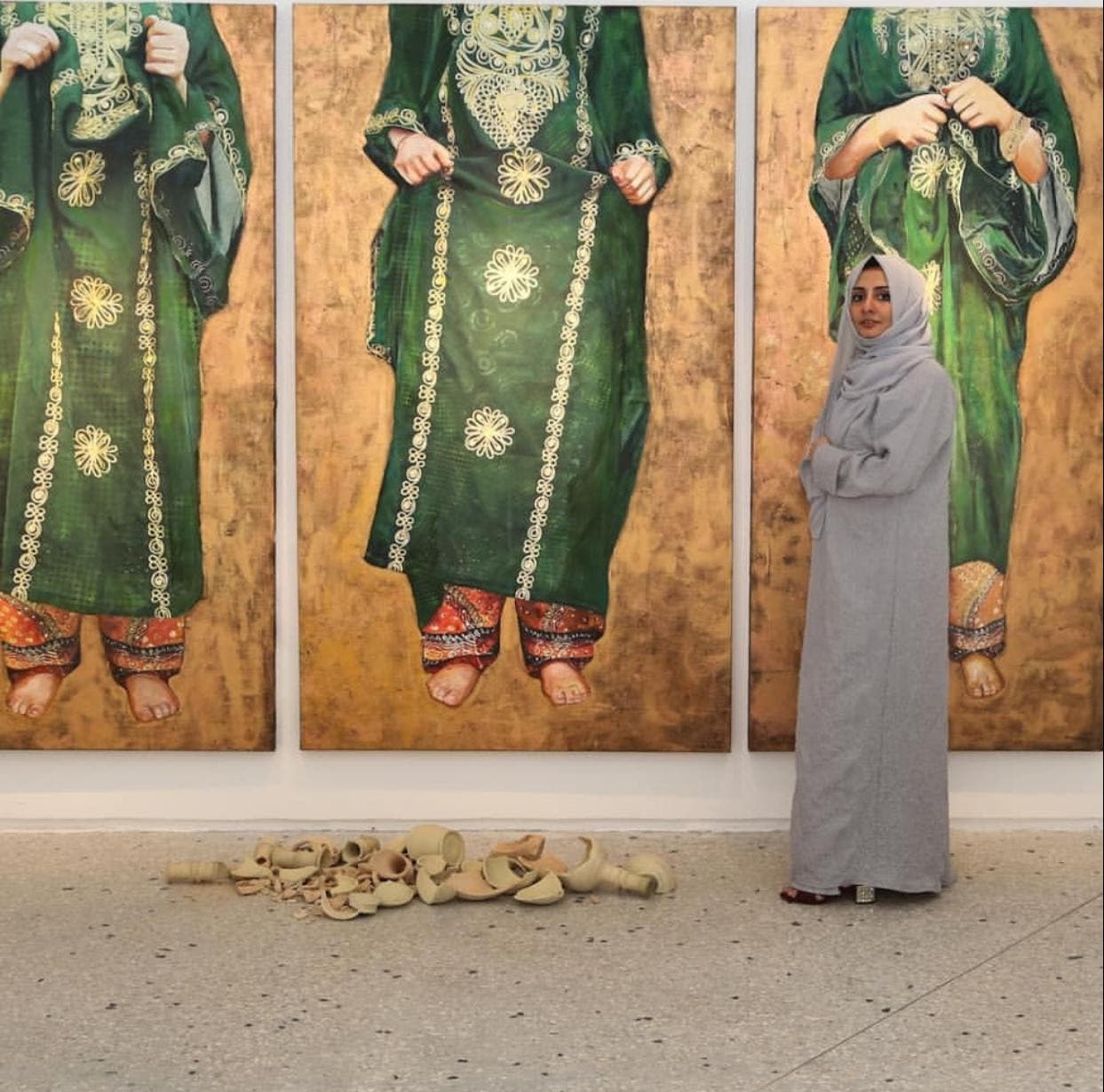 وأضافت القول: ”درست أساسيات الفن التشكيلي، وعملت في تصميم الذهب والمجوهرات، حتى مارستُ الفن التشكيلي كأسلوب في الحياة، لكن أسعى دائماً في أعمالي إلى إبراز صورة المرأة، وما تقدمه لبلدها، حتى أصبحتُ أجسد شخصيات حقيقية كان لها الأثر في منطقتنا، ففي معرضي الأخير“ ريحانة ”عملت نوافذ على المرأة“ الحبابة والحكواتية والمعلمة ”واللاتي كان لهن دور أساسي في تثقيفهن لأبناء البلد وتربيتهن، والمعرض تجربة فريدة تتحدث عن العادات والتقاليد والطقوس الموجودة والتي تمارس في المنطقة الشرقية والخليج العربي“.