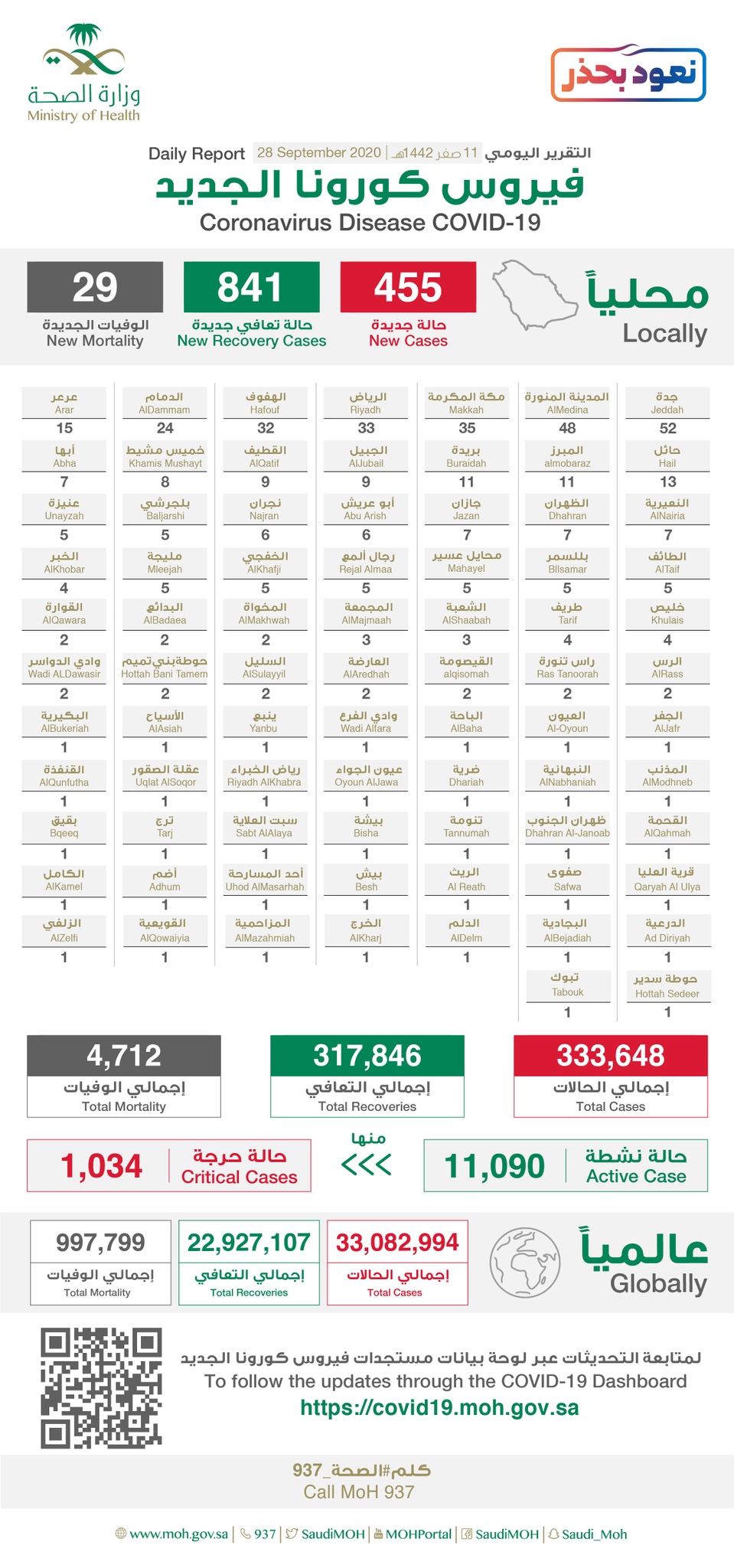 أعلنت وزارة الصحة اليوم ”الاثنين“ تسجيل 455 إصابة جديدة بفايروس كورونا المستجد المسبب لمرض ”كوفيد19“. منها 9 في القطيف و”1“ بصفوى. ليرتفع إجمالي الإصابات في المملكة إلى 333648 حالة مؤكدة.