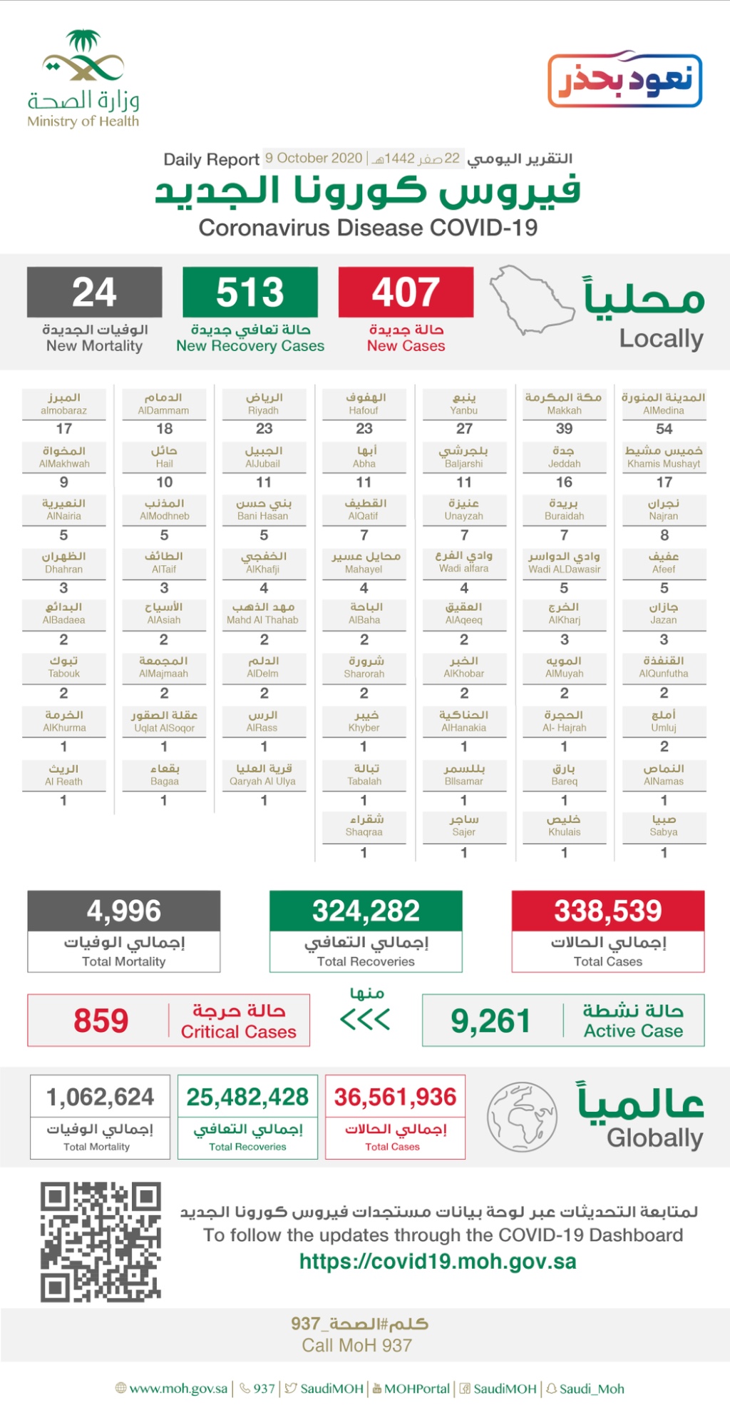 أعلنت وزارة الصحة اليوم ”الجمعة“ تسجيل 407 إصابة جديدة بفايروس كورونا المستجد المسبب لمرض ”كوفيد19“. منها 7 في القطيف. ليصبح عدد الحالات المؤكدة في المملكة «338539» حالة.
