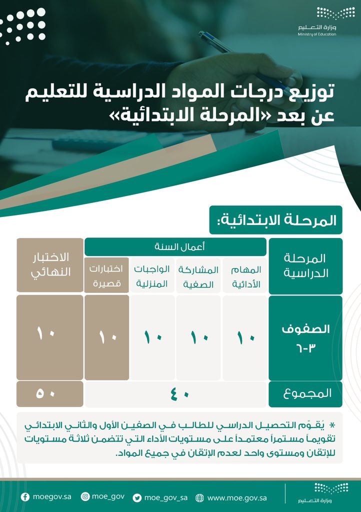 أولًا: إعادة توزيع درجات أعمال السنة والاختبارات النهائية لكل مادة دراسية استثناء للفصل الدراسي الأول معًا لتكون في المرحلتين الابتدائية والمتوسطة «40 درجة» لأعمال السنة «اختبارات قصيرة، مهمات أدائية، مشاركات صفية واجبات منزلية» و«1» درجات للاختبار النهائي، والمرحلة الثانوية وفق الجدول المرفق.