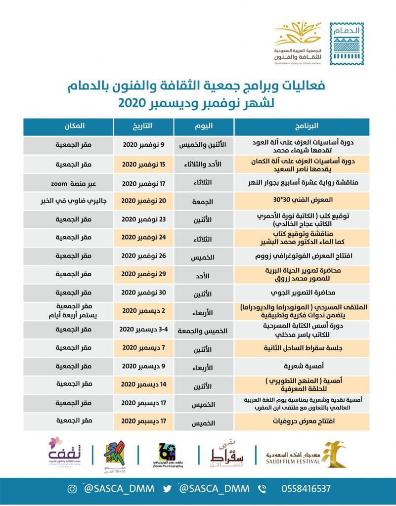 أعلنت جمعية الثقافة والفنون في الدمام أمس عن حزمة برامجها لشهر نوفمبر وديسمبر التي تجاوزت 20 فعالية تنوعت بين المعارض الفنية والعروض المسرحية والندوات الثقافية والنقدية بالإضافة إلى الدورات التدريبية.