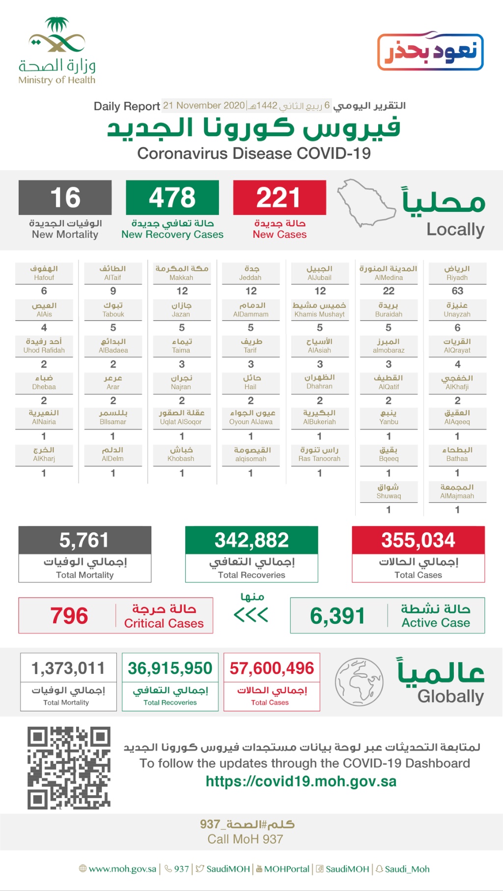 ولمعرفة تفاصيل إجمالي توزيع حالات الإصابة والتعافي، يمكن زيارة الموقع الإلكتروني المخصص من وزارة الصحة للاطلاع على مستجدات الفايروس في المملكة، والإحصاءات اليومية عبر الرابط https://covid19.moh.gov.sa/