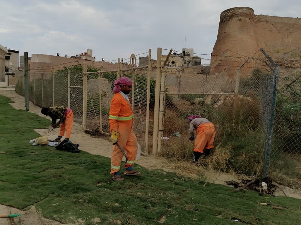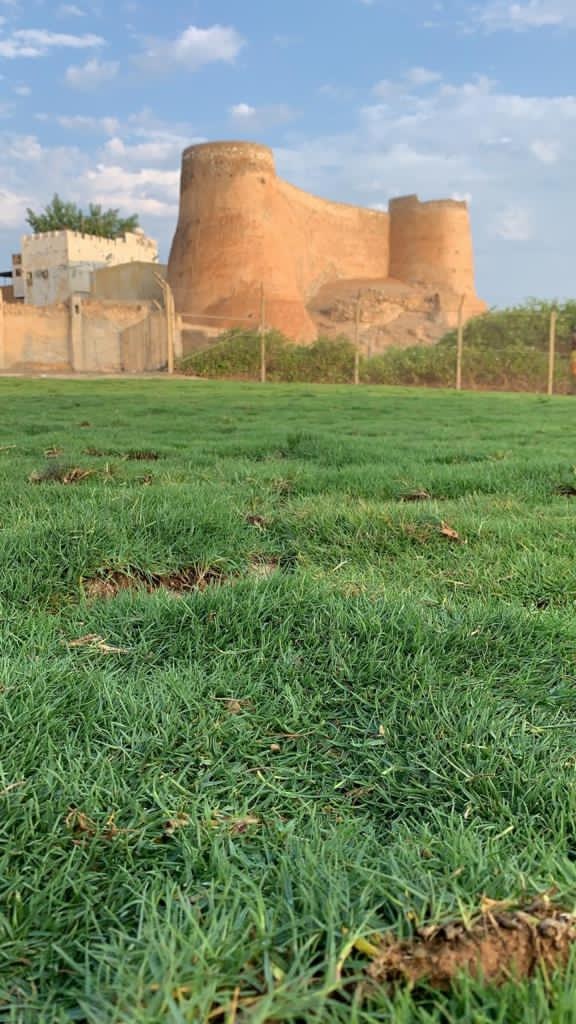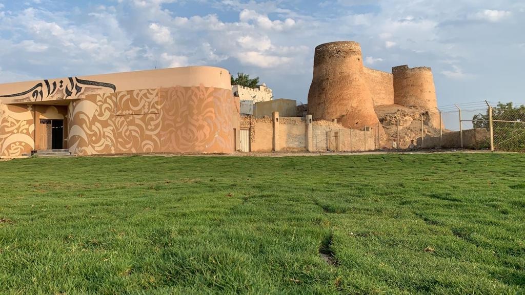 بعد إنارتها.. تزيين محيط قلعة تاروت بالمسطحات الخضراء