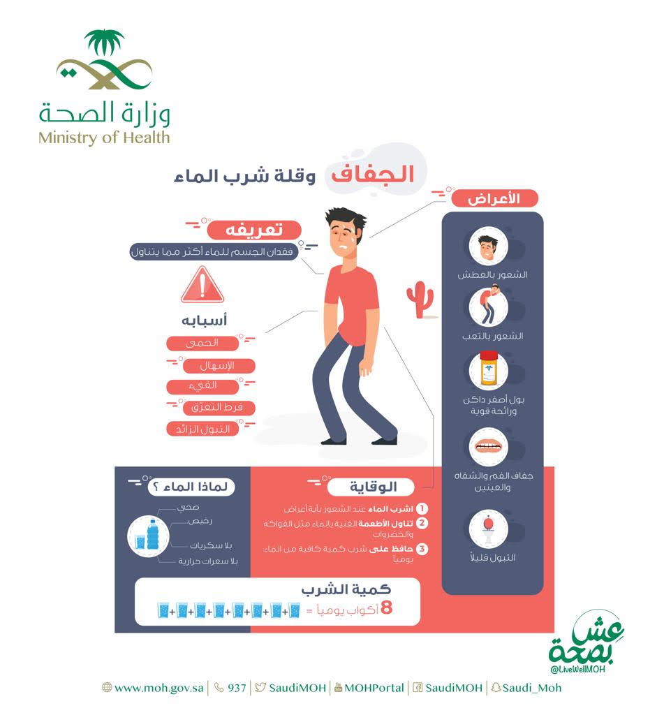 وعرّفت الصحة الجفاف وقلة شرب الماء بفقدان الجسم للماء أكثر مما يتناول مشيرةً ألى أن عوامل الخطورة تكمن بسبب عدم تناول الماء بالحمى والإسهال والقيئ وفرط التعرق والتبول الزائد.