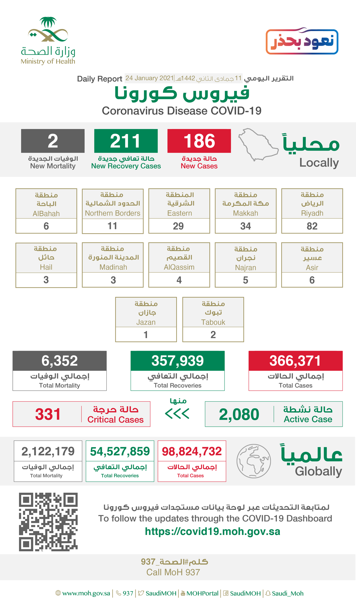 كما أعلنت الصحة عن تسجيل ”211“ حالة تماثلت للشفاء، ليصل مجموع المتعافين إلى ”357939“ حالة تعافي، فيما ارتفع إجمالي الوفيات في المملكة إلى ”6352“ حالة بعد تسجيل ”2“ حالة وفاة جديدة