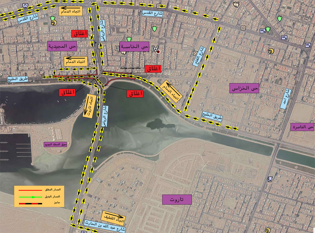 فتحت بلدية محافظة القطيف اعتبارا من صباح اليوم الثلاثاء مسارا مؤقتا لطريق جسر الرياض الخارج من جزيرة تاروت نحو طريق الخليج باتجاه مدينة الدمام.