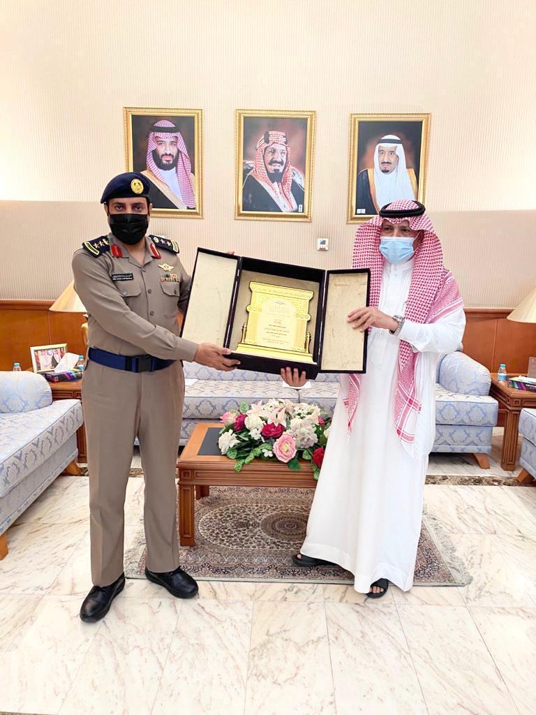 وتسلم درعاً تذكارية بهذه المناسبة، وذلك تقديراً لدعمه الكامل لجهود الدفاع المدني.