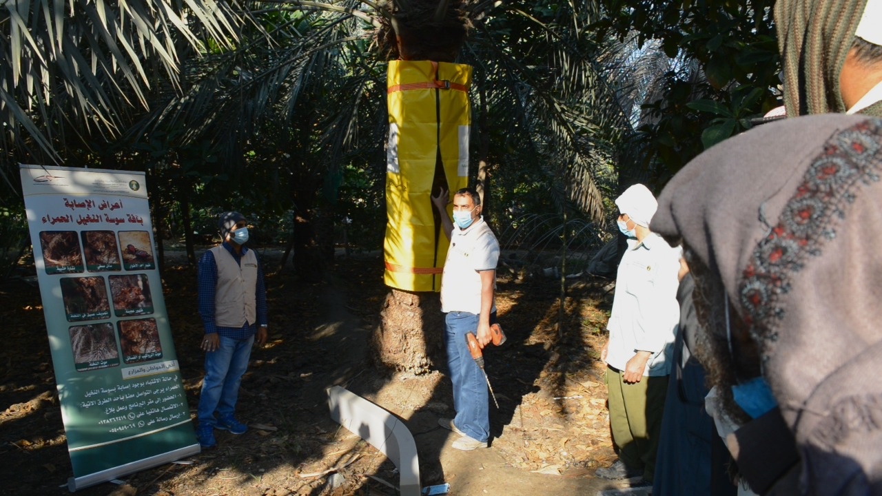 وبدأ م. سعيد الناصر اليوم الحقلي بشرح عملي بيَّن خلاله طرق العلاج المتبعة في عمليات الفحص والعلاج منذ بداية نشأة البرنامج حتى يومنا الحالي، وأهمية الفحص المبكر ومعرفة الآفات الحشرية للنخيل وطرق مكافحتها.