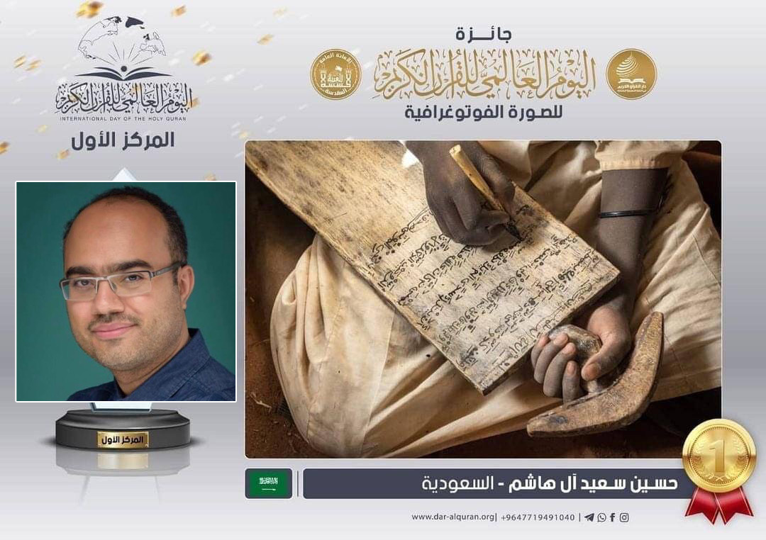 وحملت الصورة الفائزة بالمركز الأول عنوان ”تعلم كتابة القرآن على لوحة خشبية“.