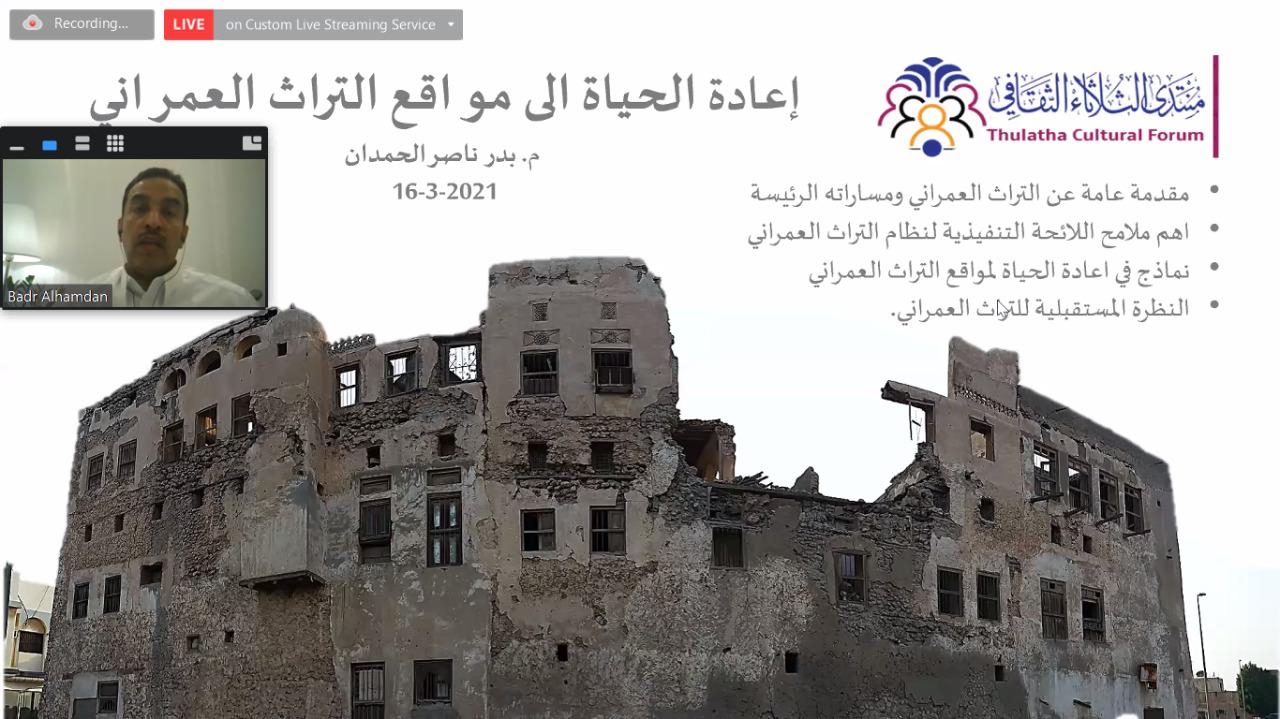 وعرف المحاضر التراث العمراني بأنه كل ما شيده الإنسان من مدن وقرة وأحياء ومبان مع ما تتضمنه من فراغات ومنشآت لها قيمة عمرانية، أو تاريخية، أو علمية، أو ثقافية، أو وطنية، وإن امتد تاريخها إلى فترة متأخرة.
