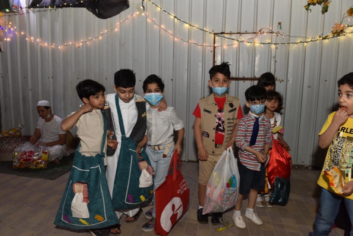 وانتشر الأطفال المتزينين بالثياب الخاصة بالقرقيعان وهم يحملون الأكياس مارين بمنازل الأقارب والجيران لجمع الهدايا والحلويات وهم يرددون بصوت مسموع ”ناصفة حلاوة اعطونا الله يعطيكم“.
