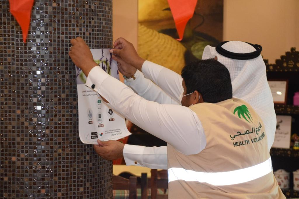ورافق الحملة عدد من المتطوعين، شاركوا بالتوعية حول أهمية الالتزام بالإجراءات الوقائية، وتوزيع الملصقات التي تتضمن «باركود» لجميع الاشتراطات الصحية لكل منشأة.