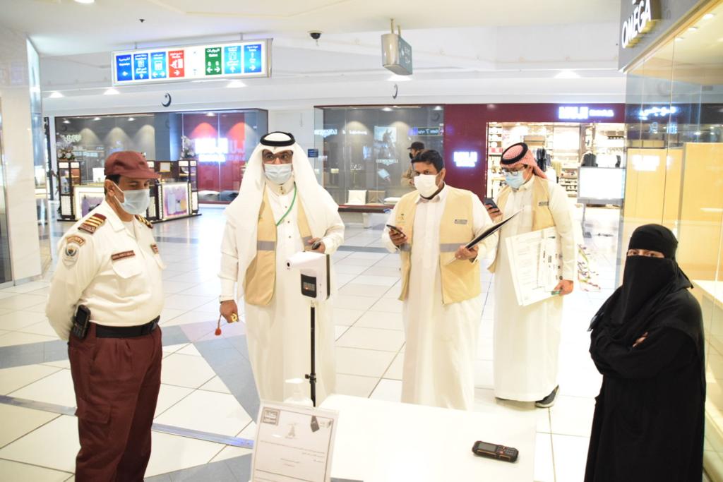 وقامت الفرق بتوعية زوار المجمعا التجارية بضرورة لبس الكمام والتباعد الجسدي وتعقيم اليدين, واستخدام تطبيق توكلنا.