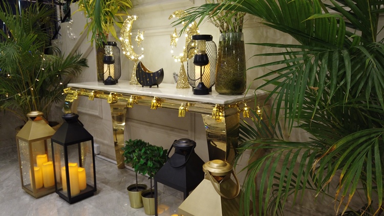 ونسقت في زواياها مجموعة من الفوانيس باختلاف أحجامها والمواد المصنوعة منها، فبعضها صُنع من القش والصوف، وبعضها من الخيوط والقماش، وكذلك من الفلين والمعدن ومطليات الذهب.