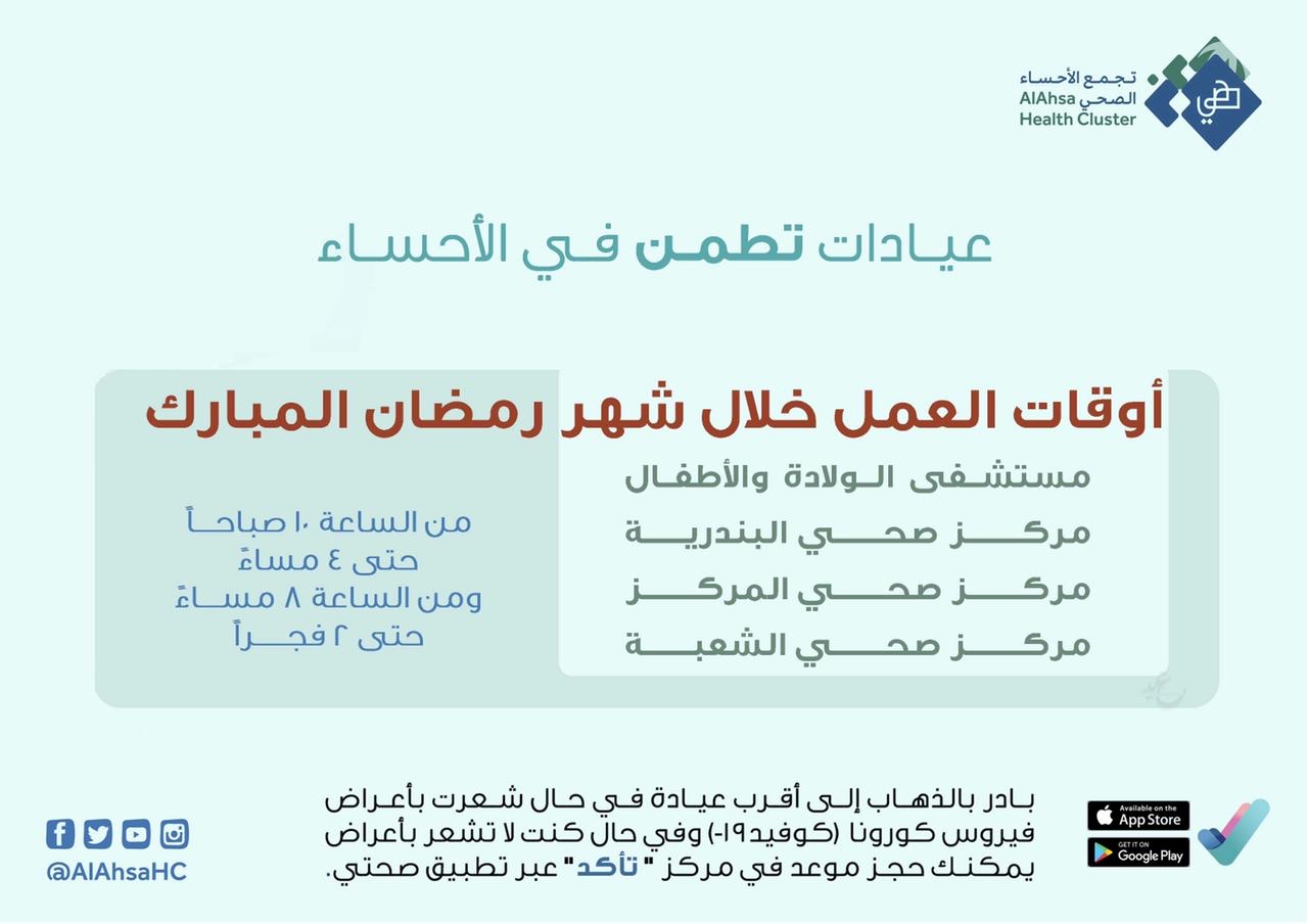 يذكر ??أن عيادات ”تطمن“ متاحة في كلاً من مركز صحي «البندرية - الشعبة - المركز» ??، إضافة للعيادة الجديدة بجوار مستشفى الولادة والأطفال، وجميعها تعمل خلال شهر رمضان المبارك من الساعة 10 صباحًا حتى 4 مساءً، ومن الساعة 8 مساءً حتى 2 فجراً.