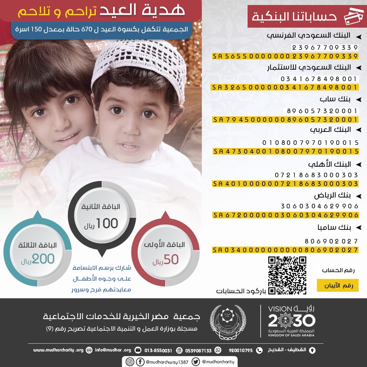 بعنوان ”تراحم وتلاحم“، تستقبل جمعية مضر الخيرية مساهماتكم لبرنامج العيدية السنوي للأسر المتعففة، وذلك من خلال إيصال هدية العيد لـ 150 أسرة، وعبر طرح باقات ثلاث ”الاولى 50 ريالًا - الثانية100 ريال - الثالثة 200 ريال“.