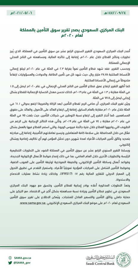 جاء ذلك في التقرير السنوي الرابع عشر عن سوق التأمين في المملكة، الذي أصدره البنك المركزي السعودي، ويُبرز تطورات ونتائج القطاع خلال عام 2020. إضافة إلى نتائجه المالية، وإسهامه في الناتج المحلي الإجمالي.