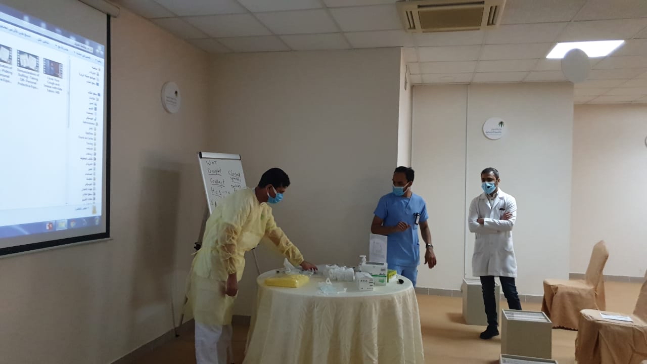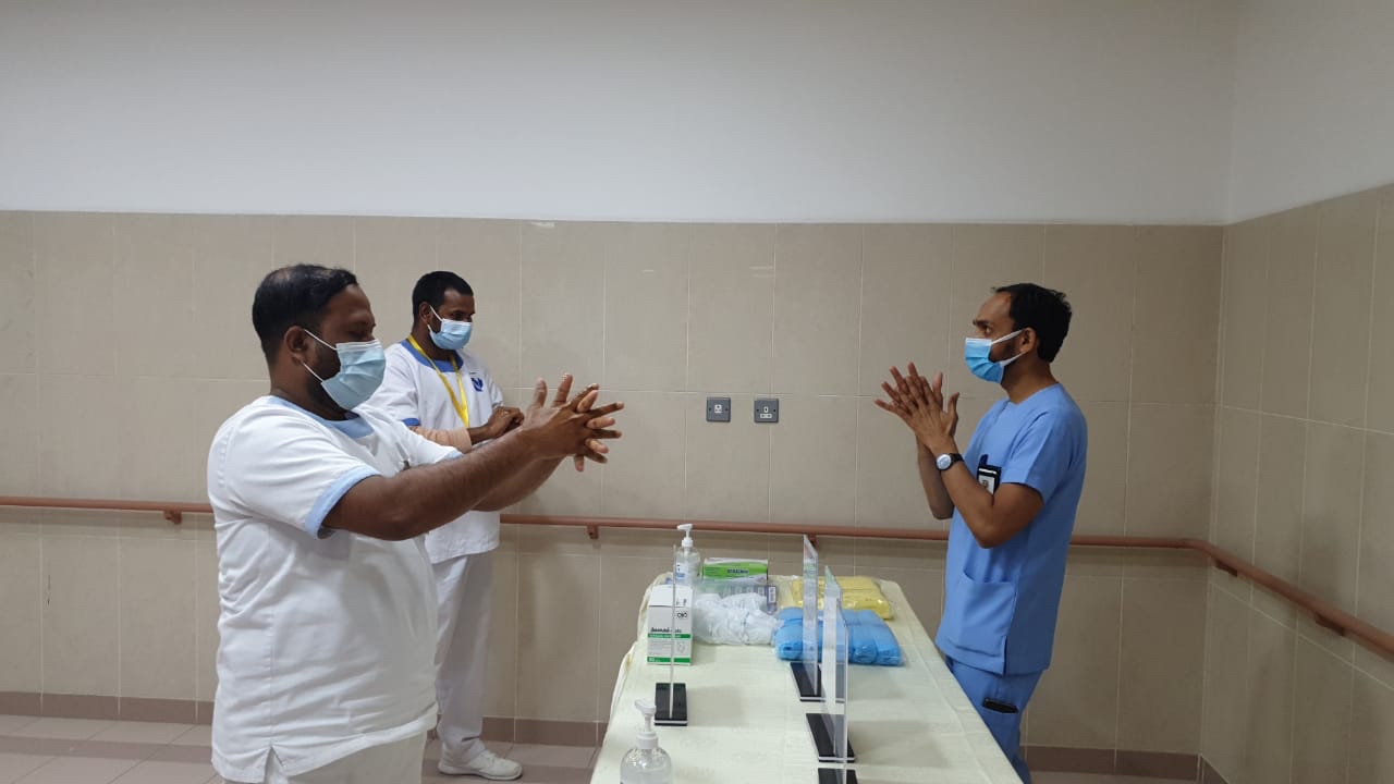وألقى رئيس قسم الخدمات الطبية بالمركز الدكتور حسين الشويخات، محاضرة قدم فيها شرحًا وافيًا للطرق الصحيحة لعمليات غسيل الايدي وتعقيمها وكذلك ارتداء الكمام وواقي الوجة والجسم والطرق السليمة للتخلص منها، مع عرض فيديوهات توضيحية مع مشاركة احد الفنيين للشرح باللغة الأوردية لضمان وصول المعلومة.