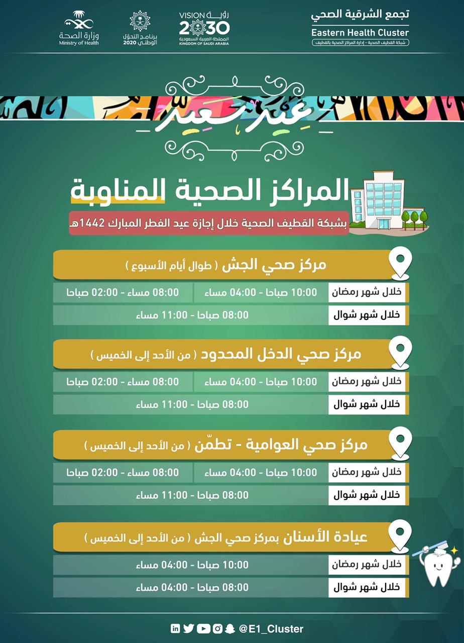 بالأسماء.. المراكز الصحية العاملة خلال إجازة عيد الفطر المبارك بالقطيف