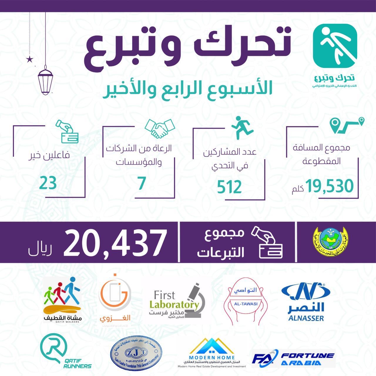 بلغت الحصيلة النهائية لفريق عدائي القطيف في البرنامج الختامي لتحدي ”تحرك وتبرع“ الخيري الذي تشرف عليه جمعية تاروت الخيرية نحو: 20,437 ريالا، وذلك بعد ان قطع أكثر من 510 مشاركا في المشي مسافة 19530 كيلو متراً.