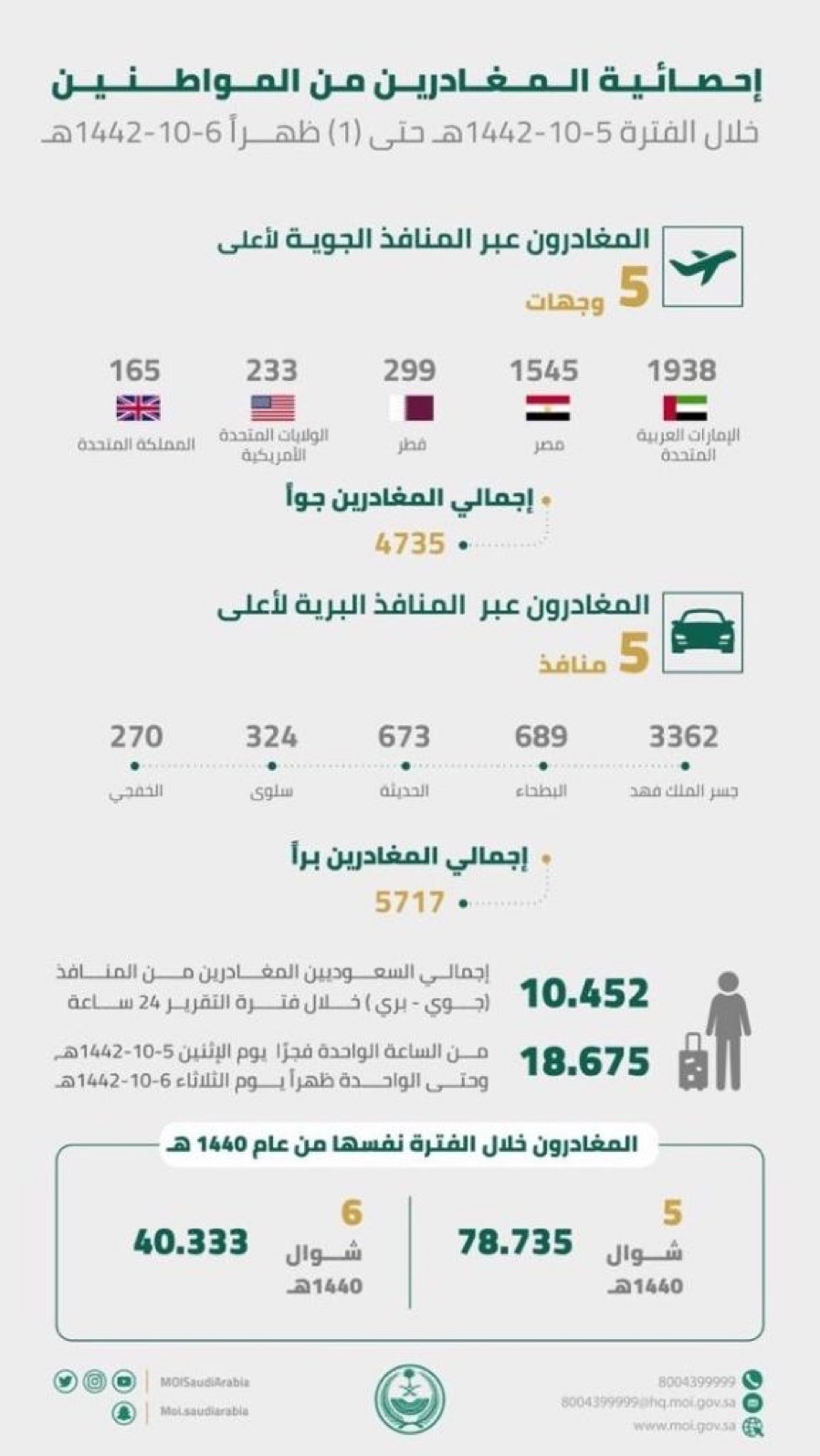 كشفت وزارة الداخلية اليوم عن إحصائية جديدة خاصة بالمواطنين المغادرين للخارج خلال اليومين الماضيين.