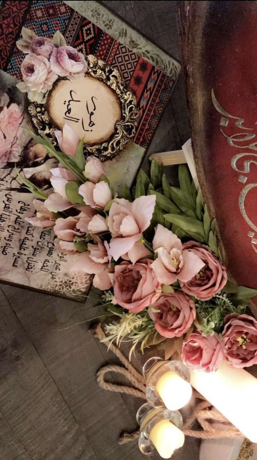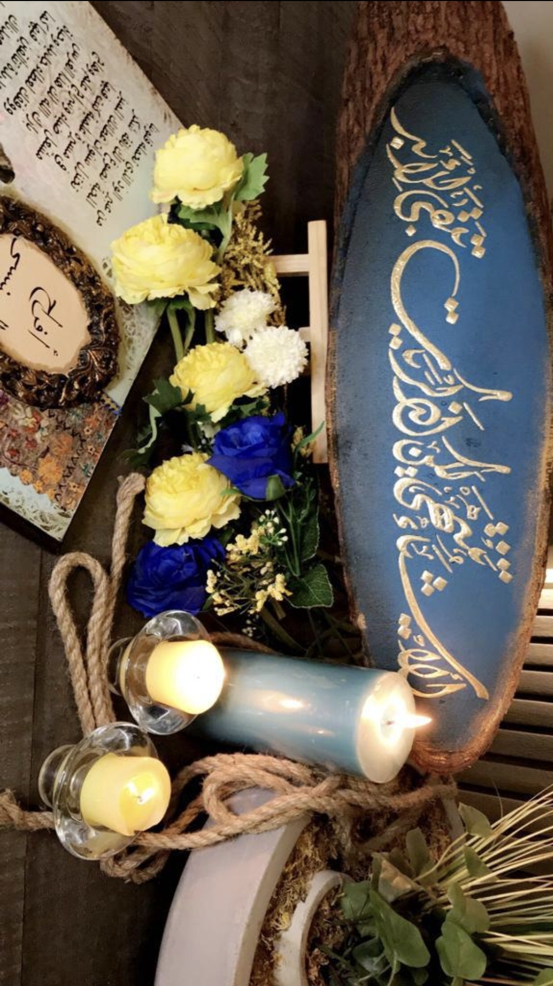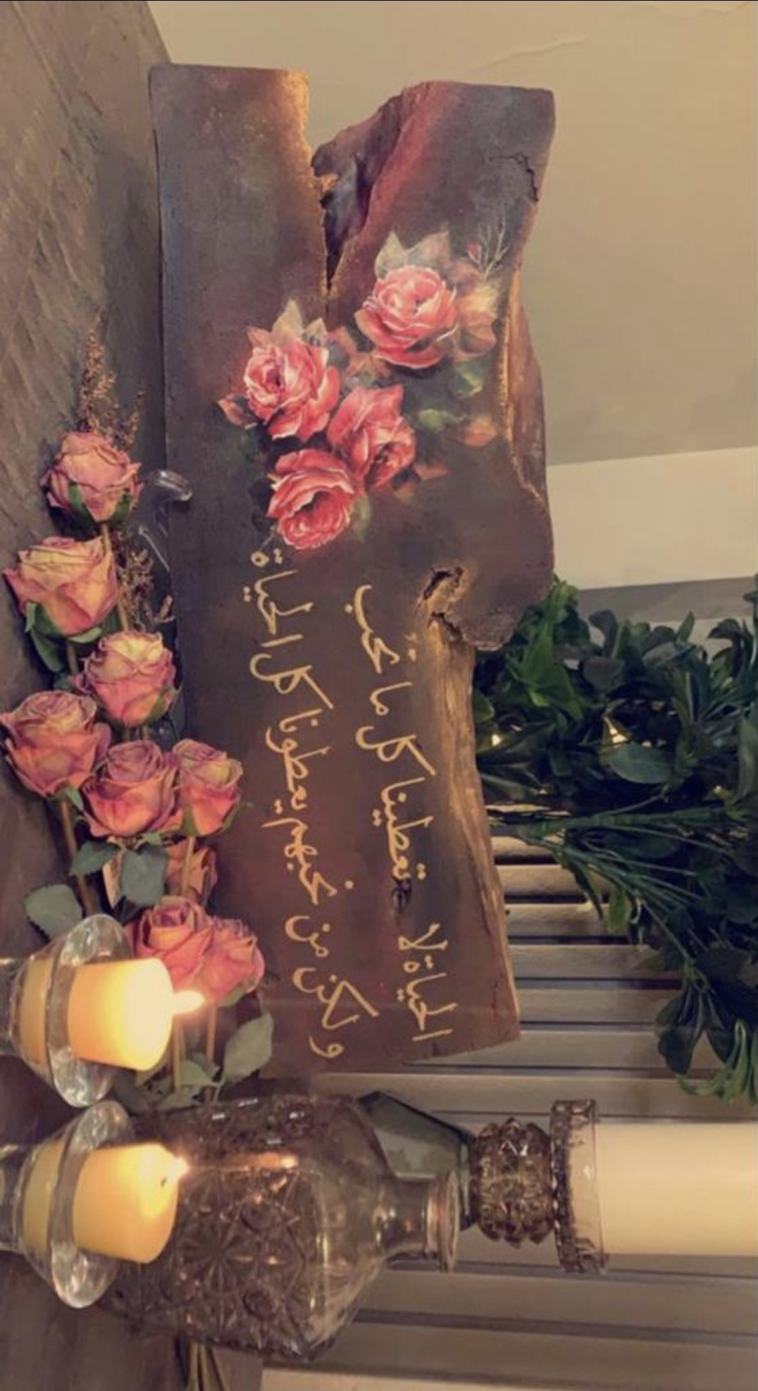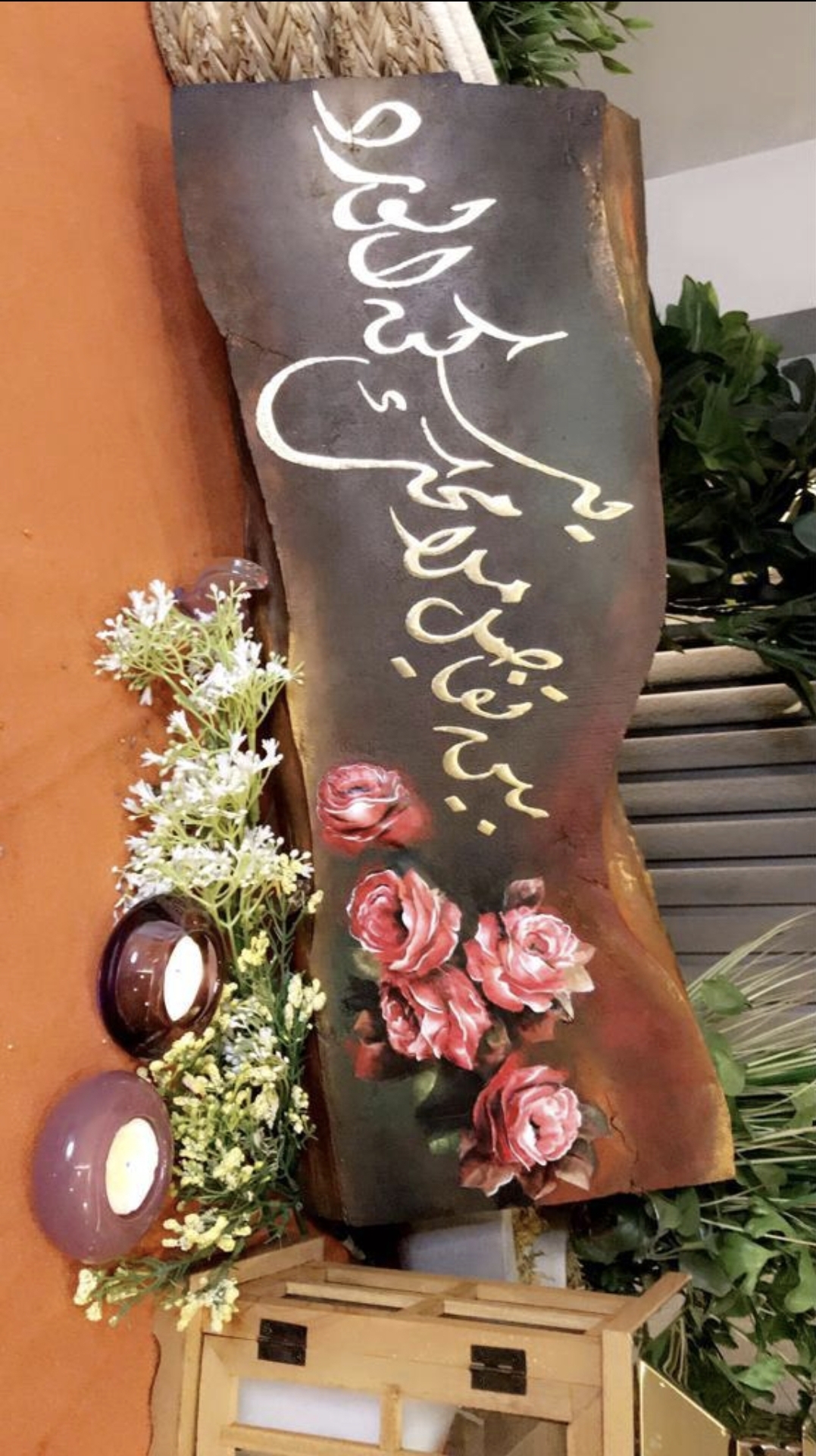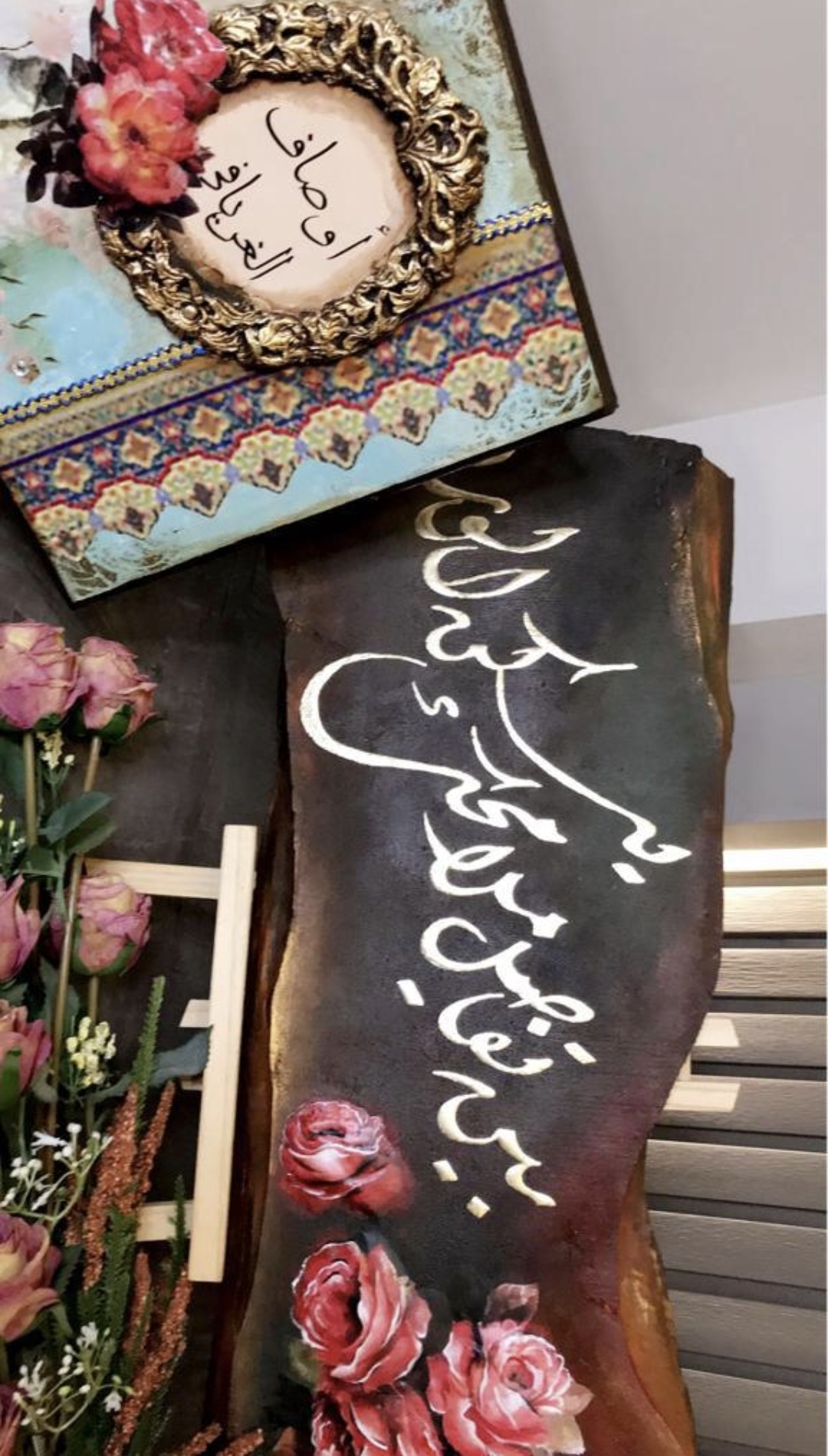 ودمجت بين الديكوباج والخط واختارت الكتابة باللون الذهبي دلالة على الفخامة ورديفا للمعدن الثمين، معتمدة في عملها على ألوان الأكريلك اللون البني والذهبي والتركواز والوردي والاسود.