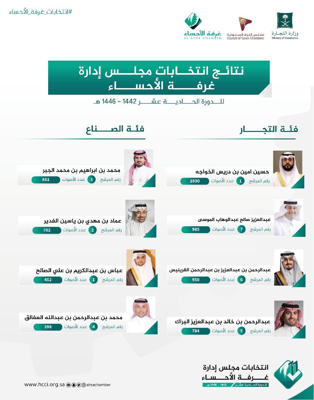 وانتهت الانتخابات بفوز أربعة مترشحين من قائمة التجار وهم: حسين الخواجه «1030 صوتا»، وعبدالعزيز الموسى «985 صوتاً»، وعبدالرحمن القرينيس «950 صوتاً»، وعبدالرحمن البراك «784 صوت»، فيما ضمت قائمة الصنّاع أربعة فائزين هم: محمد الجبر «851 صوتاً»، عماد الغدير «702 صوتاً»، وعباس الصالح «452 صوتاً»، محمد العفالق «398 صوتاً»، في حين يتبقى أربعة أشخاص معيّنين ليكتمل عقد المجلس ب12 عضواً لدورته القادمة 1442ه - 1446ه.