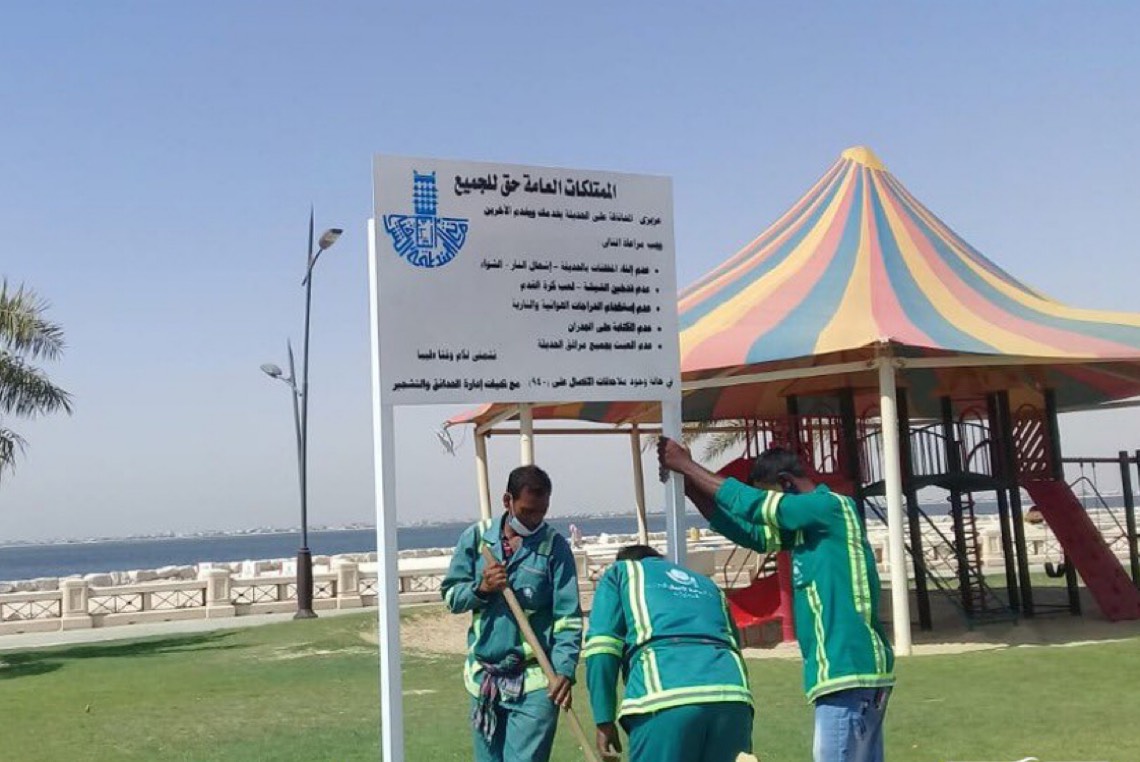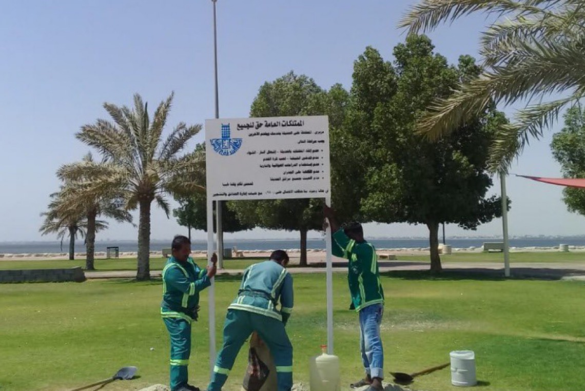أنجزت بلدية محافظة القطيف،، تركيب 26 لوحة إرشادية بالحدائق والواجهات البحرية بعبارات توعوية للحفاظ على الممتلكات العامة.