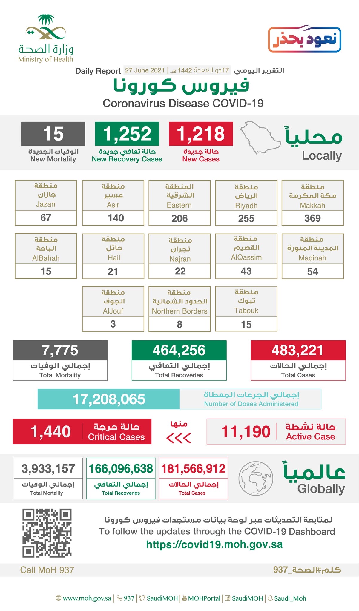 وبينت الإحصائية أن إجمالي عدد الإصابات في المملكة بلغ 483221 حالة.