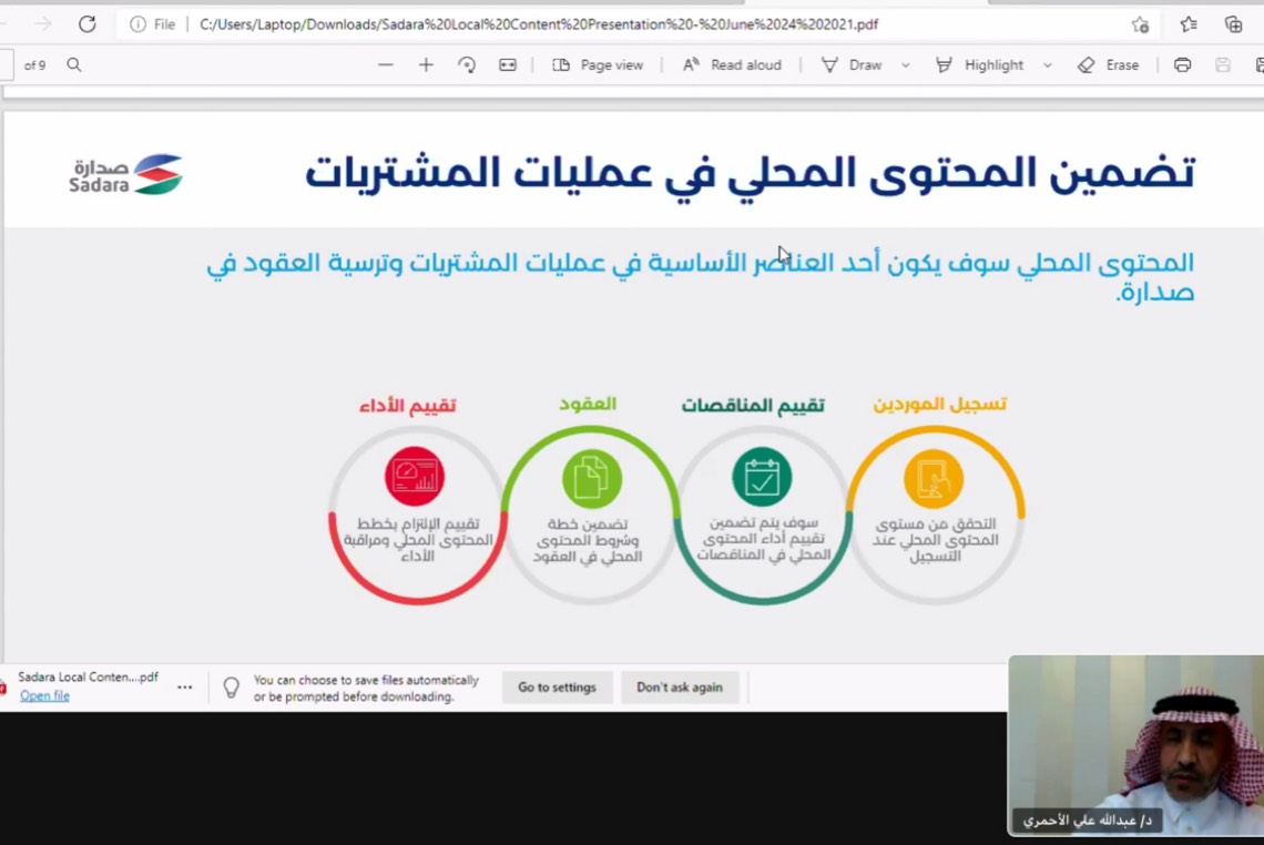 وقال الأحمري، خلال ورشة بعنوان ”تفعيل المحتوى المحلي بشركة صدارة للكيميائيات“، نظمتها غرفة الشرقية عن بعد، اليوم: إن المحتوى المحلي سيكون أحد العناصر الأساسية في عمليات المشتريات وترسية العقود في تسجيل الموردين عبر التحقق من مستوى المحتوى المحلي عند التسجيل وكذلك تقيم المناقصات عبر تضمين تقييم أداء المحتوى المحلي في المناقصات، وأيضا تضمن خطة وشروط المحتوى المحلي في العقود وأخيرا تقييم الالتزام بخطط المحتوى المحلي ومراقبة الأداء.
