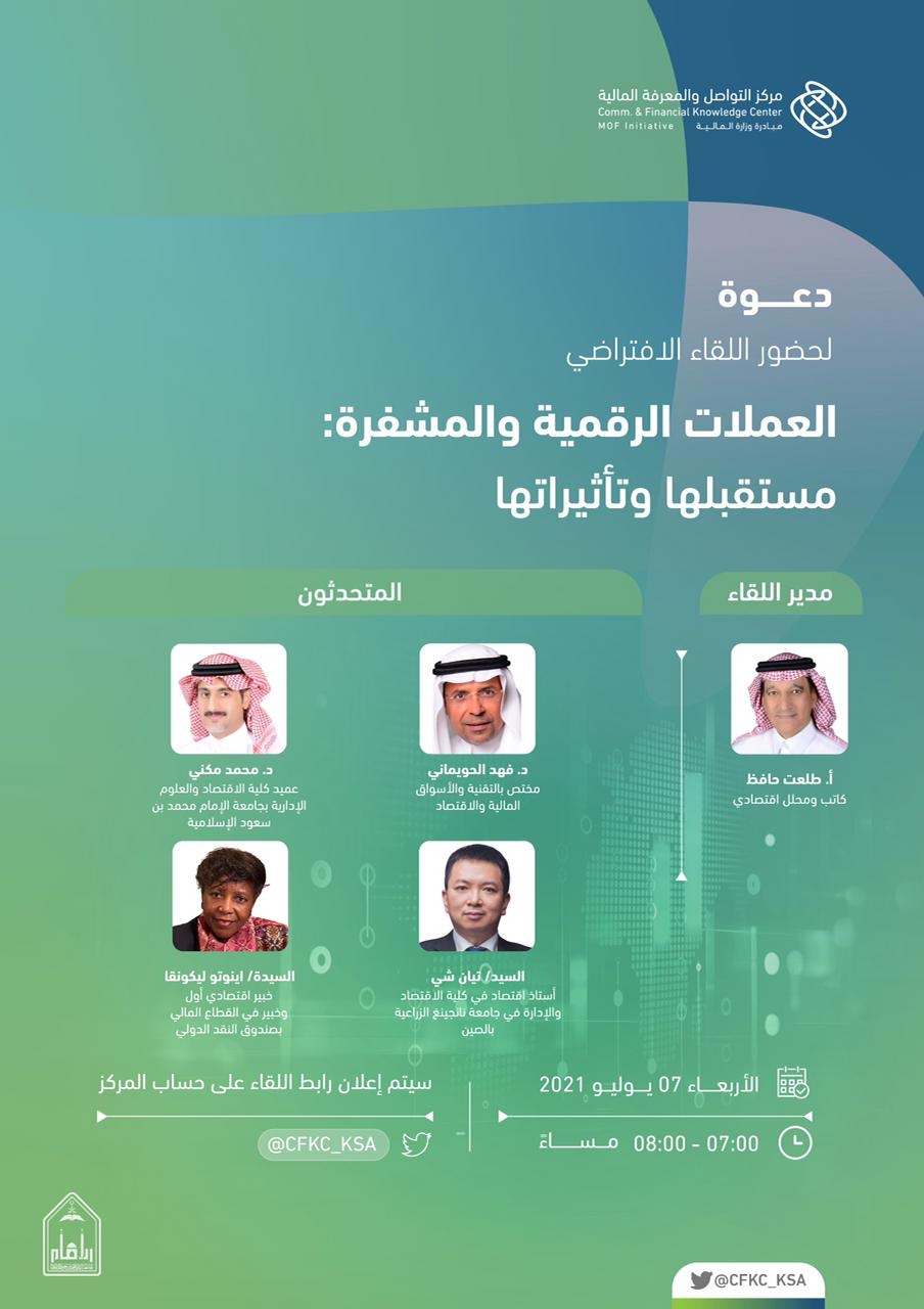 ويشهد اللقاء مشاركة كلاً من: الدكتور محمد مكني عميد كلية الاقتصاد والعلوم الإدارية بجامعة الإمام محمد بن سعود الإسلامية، والدكتور فهد الحويماني مختص بالتقنية والأسواق المالية والاقتصاد، والسيدة اينوتو ليكونقا خبير اقتصادي أول وخبير في القطاع المالي بصندوق النقد الدولي، والسيد تيان شي أستاذ الاقتصاد في كلية الاقتصاد والإدارة بجامعة نانجينغ الزراعية في الصين، فيما يدير اللقاء طلعت حافظ الكاتب والمحلل الاقتصادي.