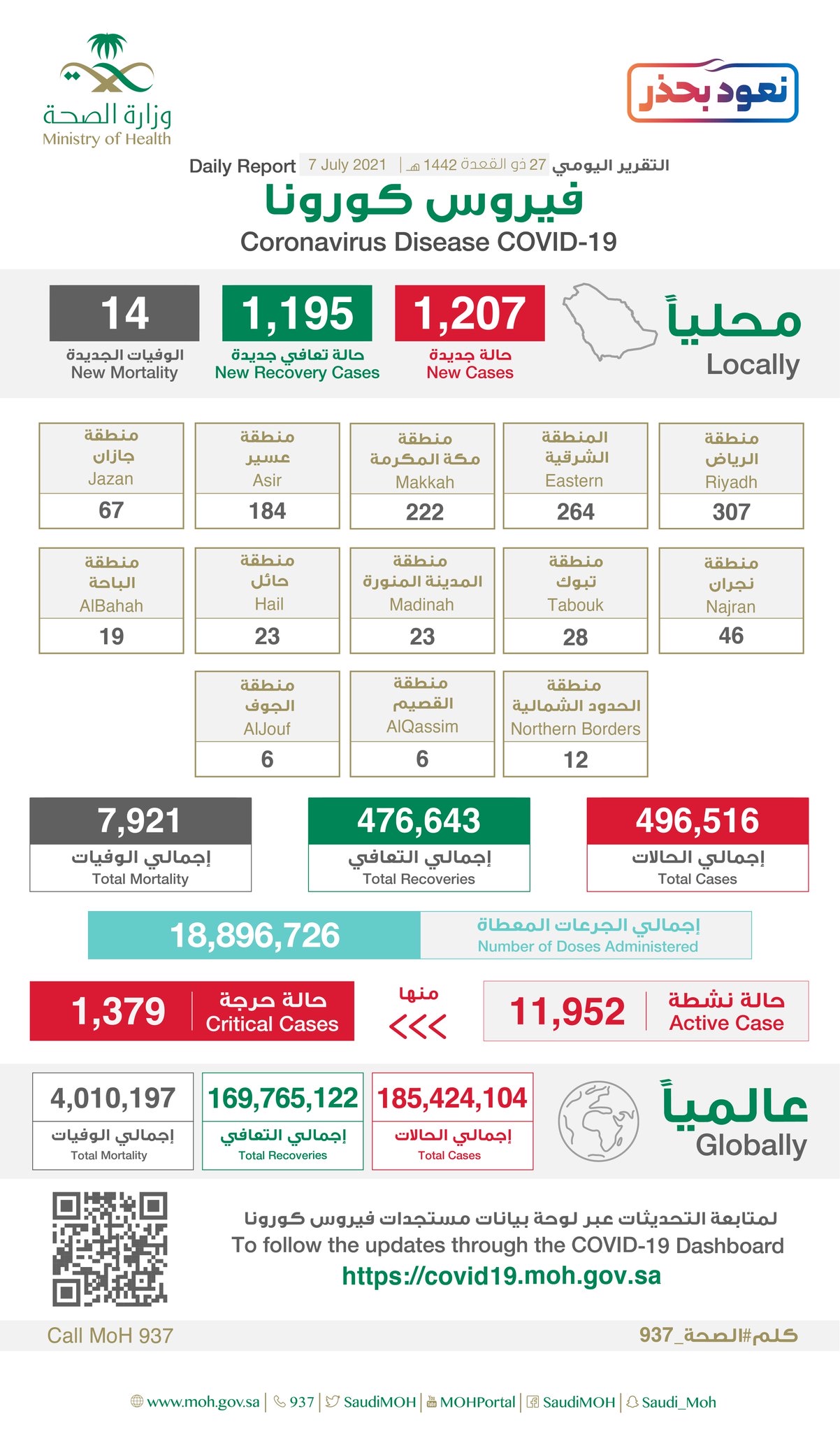 كما أعلنت الصحة عن تسجيل ”1195“ حالة تماثلت للشفاء، ليصل مجموع المتعافين إلى ”476643“ حالة تعافي، فيما ارتفع إجمالي الوفيات في المملكة إلى 7921 حالة بعد تسجيل ”14“ حالة وفاة جديدة.