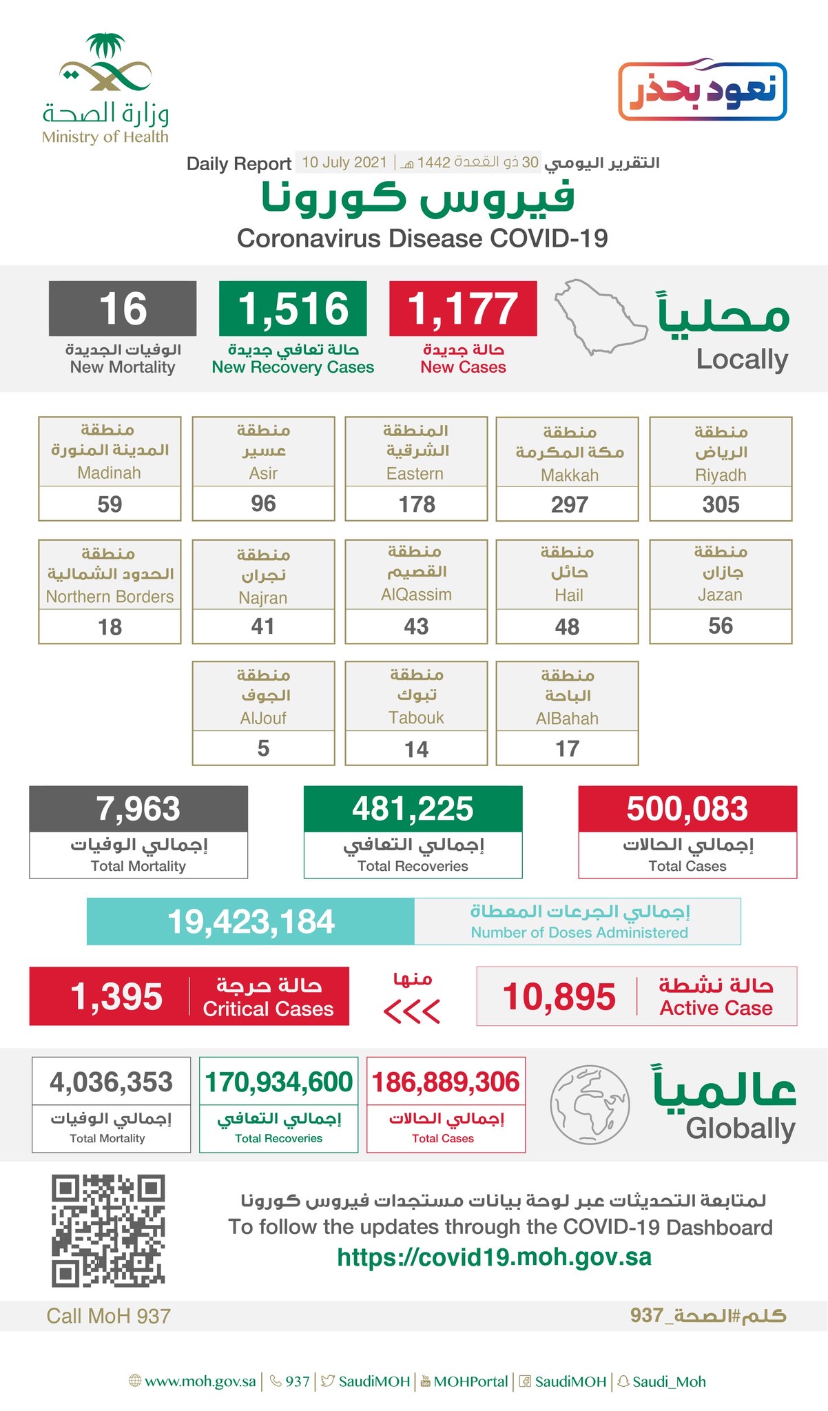 وبلغ إجمالي الحالات النشطة 10895 حالة، منها 1395 حالة حرجة.